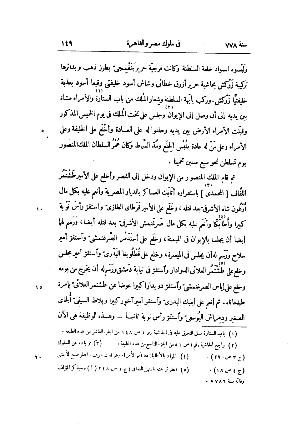 ثم قام الملك المنصور من الإيوان ودخل إلى القصر وأخلع على الأمير طشتمر اللفّاف [المحمدى «3» ] باستقراره أتابك العساكر بالديار المصرية وأنعم عليه بكل مال أرغون شاه الأشرفىّ بعد قتله، وخلع على الأمير قرطاى الطازىّ واستقرّ رأس نوبة كبيرا وأطابكا «4» وأنعم عليه بكل مال صرغتمش الأشرفىّ بعد قتله أيضا، ورسم لهما أيضا أن يجلسا بالإيوان في الميمنة، وخلع على أسندمر الصّرغتمشىّ واستقرّ أمير سلاح ورسم له أن يجلس في الميسرة، وخلع على قطلوبغا البدرىّ واستقرّ أمير مجلس وخلع على طشتمر «5» العلائى الدوادار واستقرّ في نيابة دمشق ورسم له أن يخرج من يومه وخلع على إياس الصرغتمشىّ واستقرّ دويدارا كبيرا عوضا عن طشتمر العلائىّ بإمرة طبلخاناه. ثم أنعم على أينبك البدرىّ واستقر أمير آخور كبيرا وبلاط السيفىّ ألجاى الصغير ودمراش اليوسفىّ واستقرّ رأس نوبة ثانيا- وهذه الوظيفة هي الآن