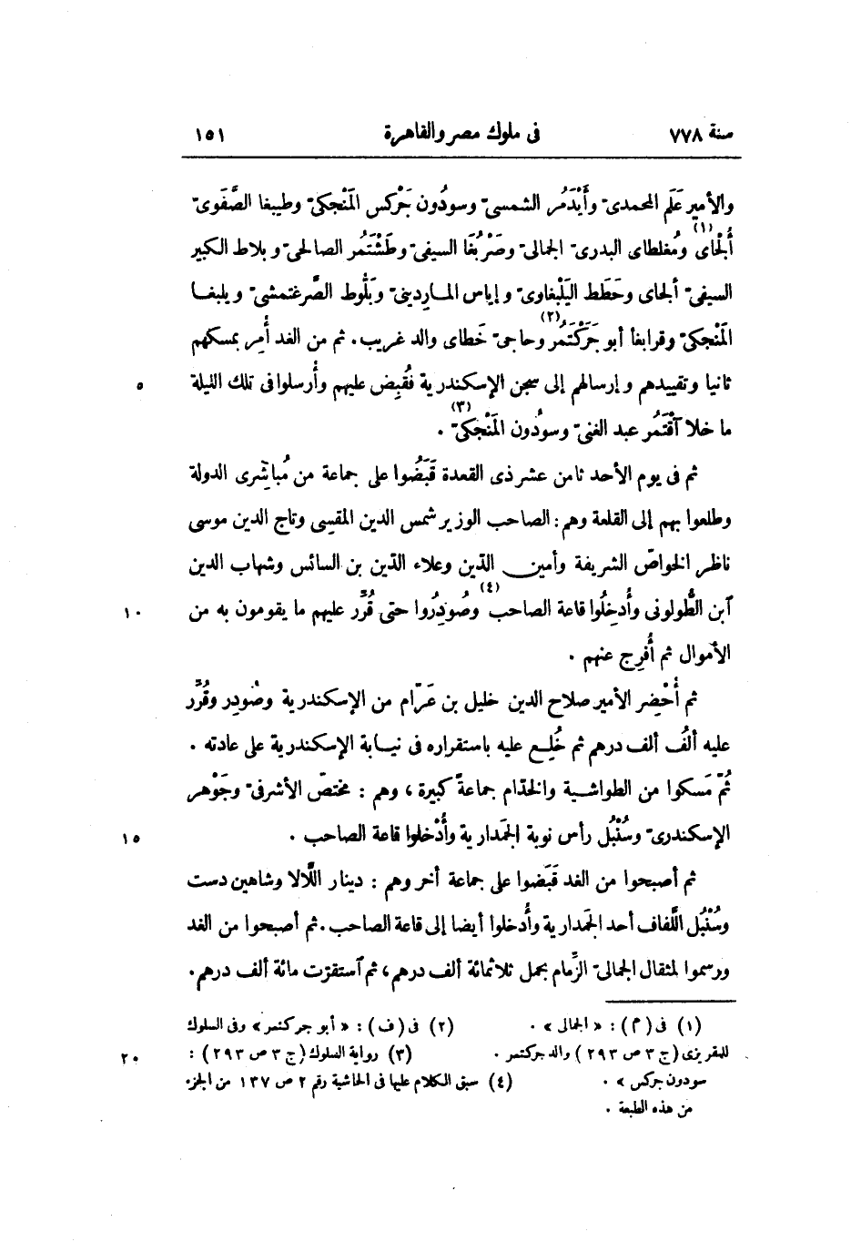 ثم أحضر الأمير صلاح الدين خليل بن عرّام من الإسكندرية وصودر وقرّر عليه ألف ألف درهم ثم خلع عليه باستقراره في نيابة الإسكندرية على عادته.