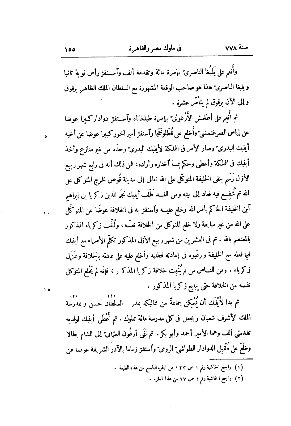 وأنعم على يلبغا الناصرىّ بإمرة مائة وتقدمة ألف واستقرّ رأس نوبة ثانيا ويلبغا الناصرىّ هذا هو صاحب الوقعة المشهورة مع السلطان الملك الظاهر برقوق وإلى الآن برقوق لم يتأمّر عشرة.