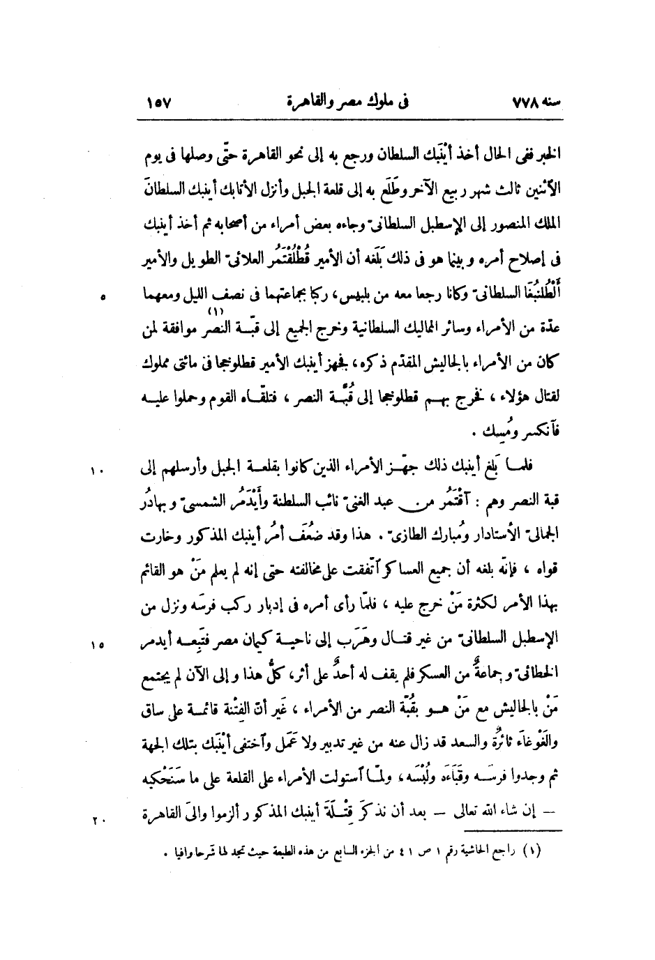 الخبر ففى الحال أخذ أينبك السلطان ورجع به إلى نحو القاهرة حتّى وصلها في يوم الاثنين ثالث شهر ربيع الآخر وطلع به إلى قلعة الجبل وأنزل الأتابك أينبك السلطان الملك المنصور إلى الإسطبل السلطانىّ وجاءه بعض أمراء من أصحابه ثم أخذ أينبك فى إصلاح أمره وبينما هو في ذلك بلغه أن الأمير قطلقتمر العلائىّ الطويل والأمير ألطنبغا السلطانىّ وكانا رجعا معه من بلبيس، ركبا بجماعتهما في نصف الليل ومعهما عدّة من الأمراء وسائر المماليك السلطانية وخرج الجميع إلى قبّة النصر «1» موافقة لمن كان من الأمراء بالجاليش المقدّم ذكره، فجهز أينبك الأمير قطلوخجا في مائتى مملوك لقتال هؤلاء، فخرج بهم قطلوخجا إلى قبّة النصر، فتلقّاه القوم وحملوا عليه فآنكسر ومسك.