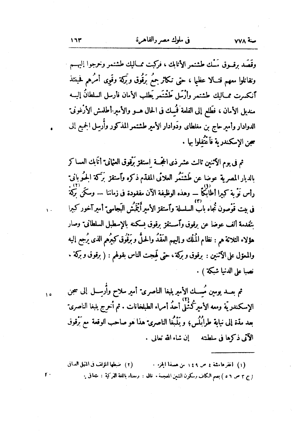 ثم في يوم الاثنين ثالث عشر ذى الحجّة استقرّ برقوق العثمانىّ أتابك العساكر بالديار المصرية عوضا عن طشتمر العلائى المقدّم ذكره واستقرّ بركة الجوبانىّ رأس نوبة كبيرا أطابكا «1» - وهذه الوظيفة الآن مفقودة في زماننا- وسكن بركة «2» فى بيت قوصون تجاه باب (3) السلسلة واستقرّ الأمير أيتمش البجاسىّ أمير آخور كبيرا بتقدمة ألف عوضا عن برقوق واستقرّ برقوق بسكنه بالإسطبل السلطانىّ وصار هؤلاء الثلاثة هم: نظام الملك وإليهم العقد والحلّ وبرقوق كبيرهم الذي يرجع إليه والمعوّل على الاثنين: برقوق وبركة، حتى لهجت الناس بقولهم: (برقوق وبركة، نصبا على الدنيا شبكة) .