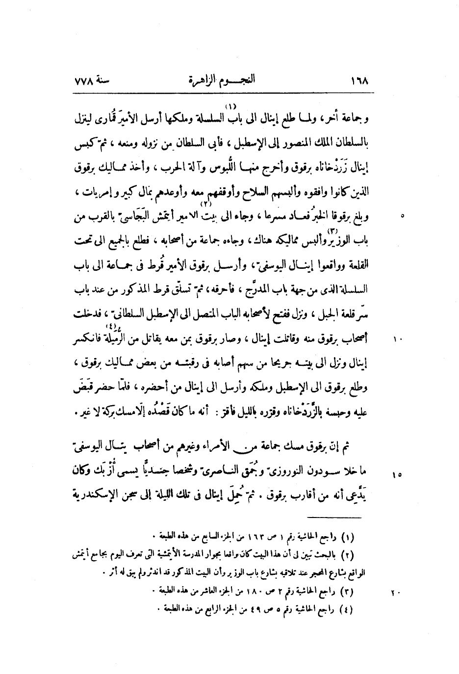 وجماعة أخر، ولما طلع إينال الى باب «1» السلسلة وملكها أرسل الأمير قمارى لينزل بالسلطان الملك المنصور إلى الإسطبل، فأبى السلطان من نزوله ومنعه، ثمّ كبس إينال زردخاناه برقوق وأخرج منها اللّبوس وآلة الحرب، وأخذ مماليك برقوق الذين كانوا وافقوه وألبسهم السلاح وأوقفهم معه وأوعدهم بمال كبير وإمريات، وبلغ برقوقا الخبر فعاد مسرعا، وجاء الى بيت «2» الامير أيتمش البجاسىّ بالقرب من باب الوزير «3» وألبس مماليكه هناك، وجاءه جماعة من أصحابه، فطلع بالجميع الى تحت القلعة وواقعوا إينال اليوسفىّ، وأرسل برقوق الأمير قرط في جماعة الى باب السلسلة الذي من جهة باب المدرّج، فأحرقه، ثمّ تسلّق قرط المذكور من عند باب سرّ قلعة الجبل، ونزل ففتح لأصحابه الباب المتصل الى الإسطبل السلطانىّ، فدخلت أصحاب برقوق منه وقاتلت إينال، وصار برقوق بمن معه يقاتل من الرّميلة «4» فانكسر إينال ونزل الى بيته جريحا من سهم أصابه في رقبته من بعض مماليك برقوق، وطلع برقوق الى الإسطبل وملكه وأرسل الى إينال من أحضره، فلمّا حضر قبض عليه وحبسه بالزّردخاناه وقرّره بالليل فأقرّ: أنه ما كان قصده إلّا مسك بركة لا غير.