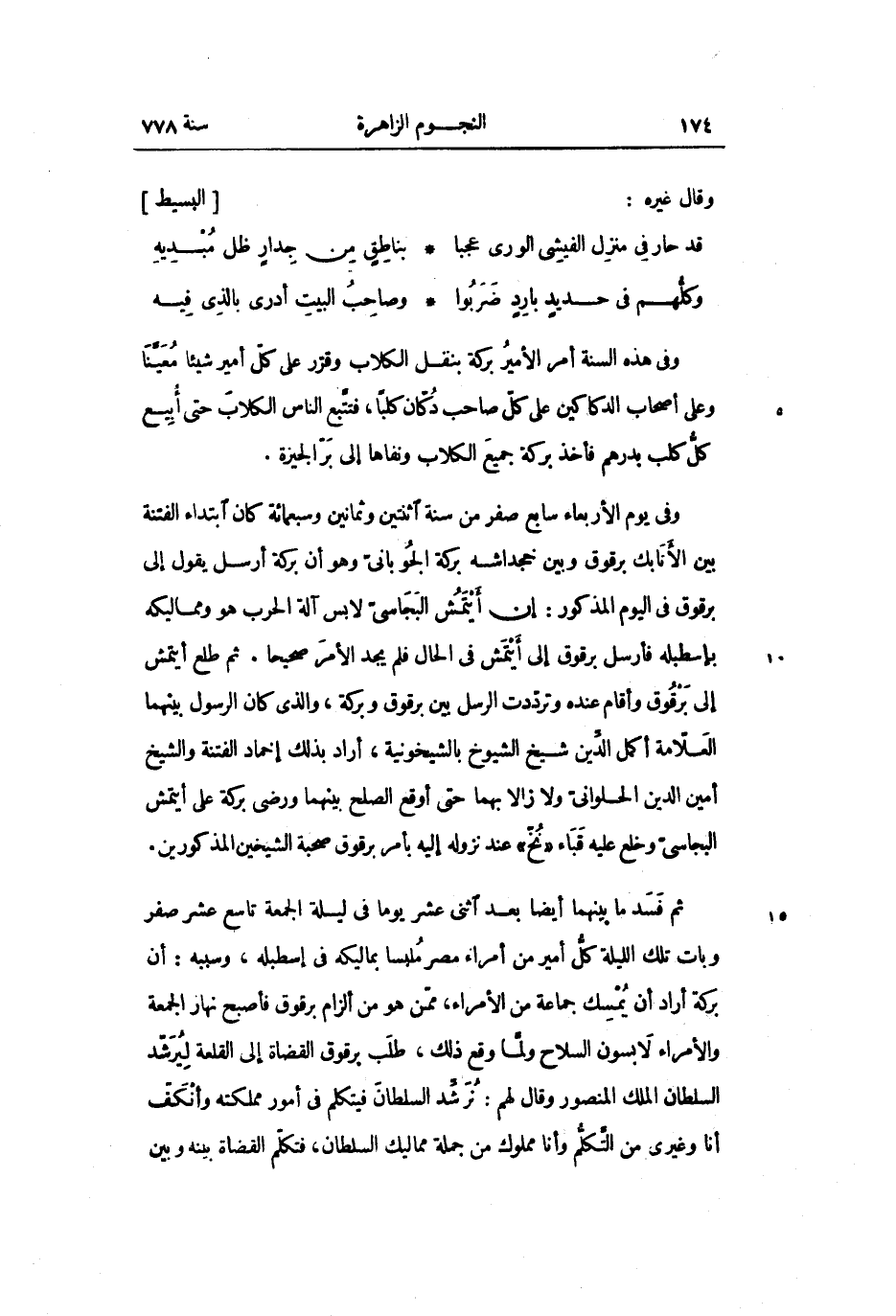 وفي يوم الأربعاء سابع صفر من سنة اثنتين وثمانين وسبعمائة كان ابتداء الفتنة بين الأتابك برقوق وبين خجداشه بركة الجوبانىّ وهو أن بركة أرسل يقول إلى برقوق في اليوم المذكور: إن أيتمش البجاسىّ لابس آلة الحرب هو ومماليكه بإسطبله فأرسل برقوق إلى أيتمش في الحال فلم يجد الأمر صحيحا. ثم طلع أيتمش إلى برقوق وأقام عنده وتردّدت الرسل بين برقوق وبركة، والذي كان الرسول بينهما العلّامة أكمل الدّين شيخ الشيوخ بالشيخونية، أراد بذلك إخماد الفتنة والشيخ أمين الدين الحلوانىّ ولا زالا بهما حتى أوقع الصلح بينهما ورضى بركة على أيتمش البجاسىّ وخلع عليه قباء «نخّ» عند نزوله إليه بأمر برقوق صحبة الشيخين المذكورين.