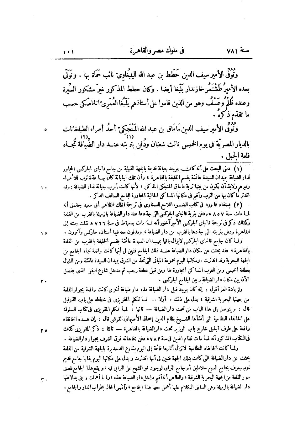 وتوفّى الأمير سيف الدين ماماق بن عبد الله المنجكىّ أحد أمراء الطبلخانات بالديار المصريّة فى يوم الخميس ثالث شعبان ودفن بتربته «1» عند دار الضّيافة «2» تجاه قلعة الجبل.