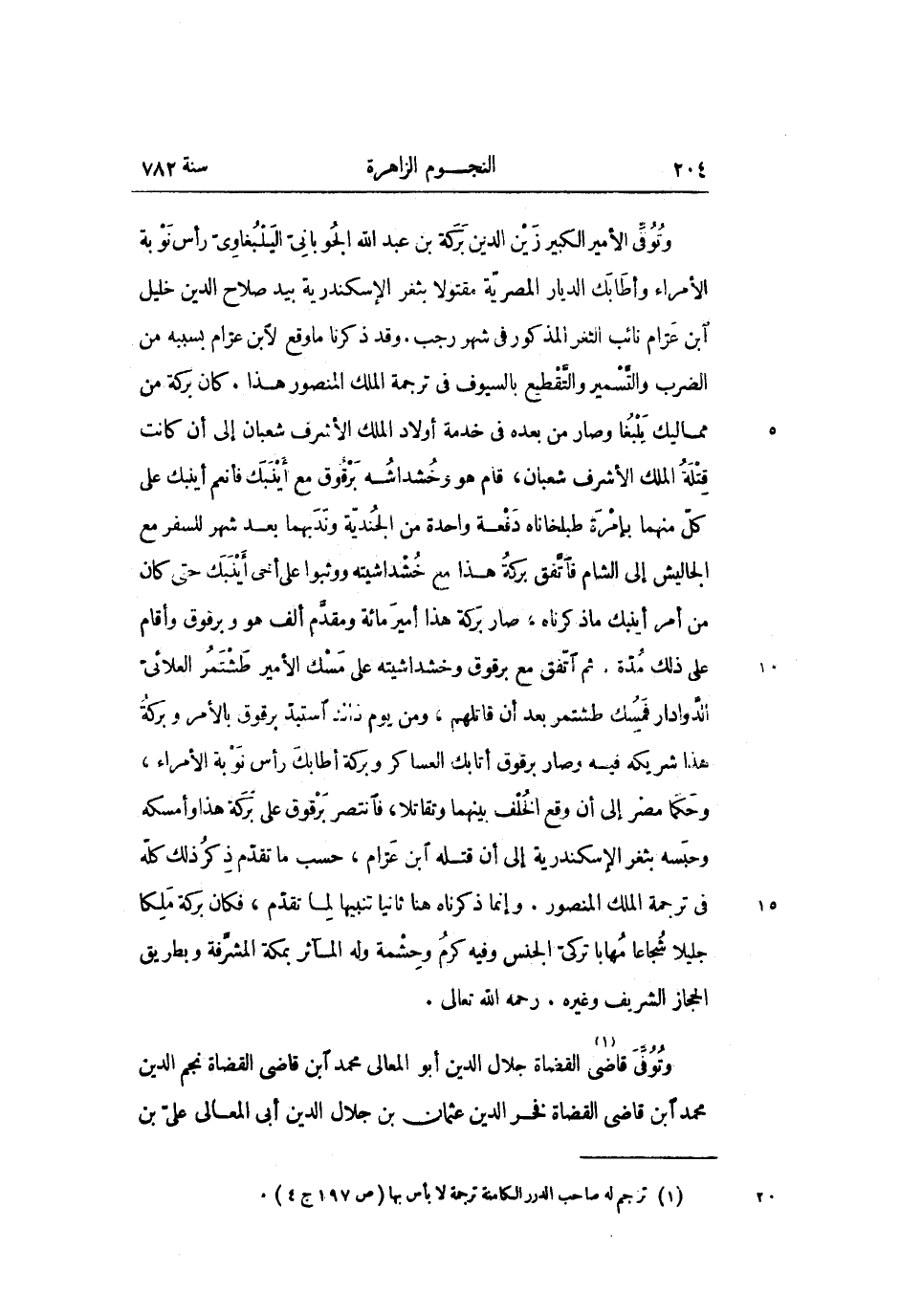وتوفّى الأمير الكبير زين الدين بركة بن عبد الله الجوبانىّ اليلبغاوىّ رأس نوبة الأمراء وأطابك الديار المصريّة مقتولا بثغر الإسكندرية بيد صلاح الدين خليل ابن عرّام نائب الثغر المذكور في شهر رجب. وقد ذكرنا ما وقع لابن عرّام بسببه من الضرب والتّسمير والتّقطيع بالسيوف في ترجمة الملك المنصور هذا. كان بركة من مماليك يلبغا وصار من بعده في خدمة أولاد الملك الأشرف شعبان إلى أن كانت قتلة الملك الأشرف شعبان، قام هو وخشداشه برقوق مع أينبك فأنعم أينبك على كلّ منهما بإمرة طبلخاناه دفعة واحدة من الجنديّة وندبهما بعد شهر للسفر مع الجاليش إلى الشام فاتّفق بركة هذا مع خشداشيته ووثبوا على أخى أينبك حتى كان من أمر أينبك ما ذكرناه، صار بركة هذا أمير مائة ومقدّم ألف هو وبرقوق وأقام على ذلك مدّة. ثم اتّفق مع برقوق وخشداشيته على مسك الأمير طشتمر العلائىّ الدّوادار فمسك طشتمر بعد أن قاتلهم، ومن يوم ذاك استبدّ برقوق بالأمر وبركة هذا شريكه فيه وصار برقوق أتابك العساكر وبركة أطابك رأس نوبة الأمراء، وحكما مصر إلى أن وقع الخلف بينهما وتقاتلا، فانتصر برقوق على بركة هذا وأمسكه وحبسه بثغر الإسكندرية إلى أن قتله ابن عرّام، حسب ما تقدّم ذكر ذلك كلّه فى ترجمة الملك المنصور. وإنما ذكرناه هنا ثانيا تنبيها لما تقدّم، فكان بركة ملكا جليلا شجاعا مهابا تركىّ الجنس وفيه كرم وحشمة وله المآثر بمكة المشرّفة وبطريق الحجاز الشريف وغيره. رحمه الله تعالى.