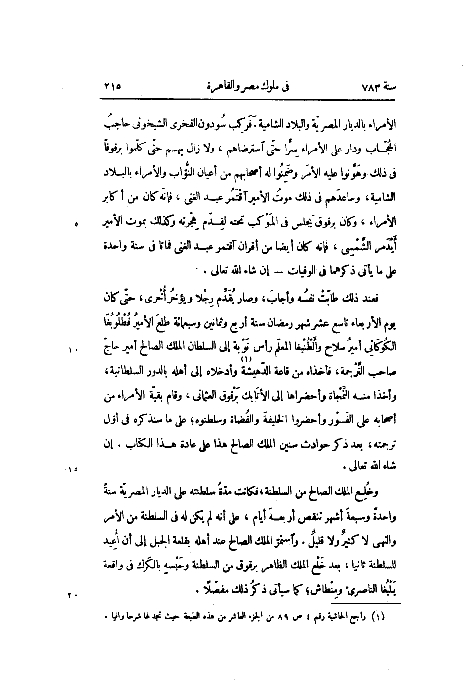 الأمراء بالديار المصريّة والبلاد الشامية. فركب سودون الفخرى الشيخونى حاجب الحجّاب ودار على الأمراء سرّا حتّى استرضاهم، ولا زال بهم حتّى كلّموا برقوقا فى ذلك وهوّنوا عليه الأمر وضمنوا له أصحابهم من أعيان النّوّاب والأمراء بالبلاد الشامية، وساعدهم في ذلك موت الأمير آقتمر عبد الغنى، فإنّه كان من أكابر الأمراء، وكان برقوق يجلس في الموكب تحته لقدم هجرته وكذلك بموت الأمير أيدمر الشّمسى، فإنه كان أيضا من أقران آقتمر عبد الغنى، فماتا في سنة واحدة على ما يأتى ذكرهما في الوفيات- إن شاء الله تعالى.