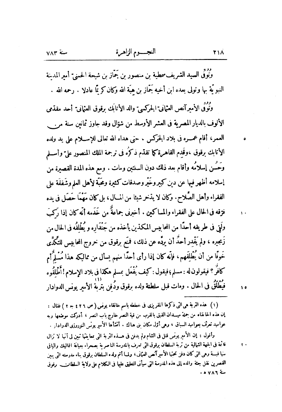وتوفّى الأمير آنص العثمانىّ الجركسىّ والد الأتابك برقوق العثمانىّ أحد مقدّمى الألوف بالديار المصرية في العشر الأوسط من شوّال وقد جاوز ثمانين سنة من العمر، أقام عمره في بلاد الجزكس، حتى هداه الله تعالى للإسلام على يد ولده الأتابك برقوق، وقدم القاهرة كما تقدّم ذكره في ترجمة الملك المنصور علىّ وأسلم وحسن إسلامه وأقام بعد ذلك دون السنتين ومات. ومع هذه المدة القصيرة من إسلامه أظهر فيها عن دين كبير وخير وصدقات كثيرة ومحبّة لأهل العلم وشفقة على الفقراء وأهل الصّلاح. وكان لا يدّخر شيئا من المال، بل كان مهما حصل في يده فرّقه في الحال على الفقراء والمساكين. أخبرنى جماعة من خدمه أنّه كان إذا ركب ولقى في طريقه أحدا من المحابيس المكدّين يأخذه من جنداره ويطلقه في الحال من زبحيره، ولم يقدر أحد أن يردّه عن ذلك، فمنع برقوق من خروج المحابيس للتّكدّى خوفا من أن يطلقهم، فإنّه كان إذا رأى أحدا منهم يسأل من مماليكه هذا مسلم أم كافر؟ فيقولون له: مسلم؛ فيقول: كيف يفعل بمسلم هكذا في بلاد الإسلام! أطلقوه فيطلق في الحال. ومات قبل سلطنة ولده برقوق ودفن بتربة «1» الأمير يونس الدوادار
