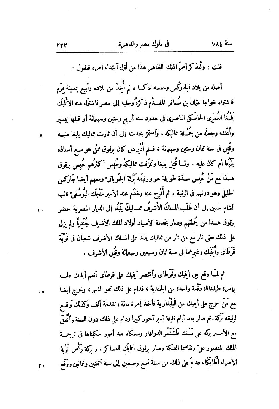 ثم لمّا وقع بين أينبك وقرطاى وانتصر أينبك على قرطاى أنعم أينبك عليه بإمرة طبلخاناة دفعة واحدة من الجندية، فدام على ذلك نحو الشهر، وخرج أيضا مع من خرج على أينبك من اليلبغارية فأخذ إمرة مائة وتقدمة ألف وكذلك وقع لرفيقه بركة. ثم صار بعد أيام قليلة أمير آخور كبيرا ودام على ذلك دون السنة واتّفق مع الأمير بركة على مسك طشتمر الدوادار ومسكاه بعد أمور حكيناها في ترجمة الملك المنصور علىّ وتقاسما المملكة وصار برقوق أتابك العساكر، وبركة رأس نوبة الأمراء أطابكا، فدام على ذلك من سنة تسع وسبعين إلى سنة اثنتين وثمانين ووقع
