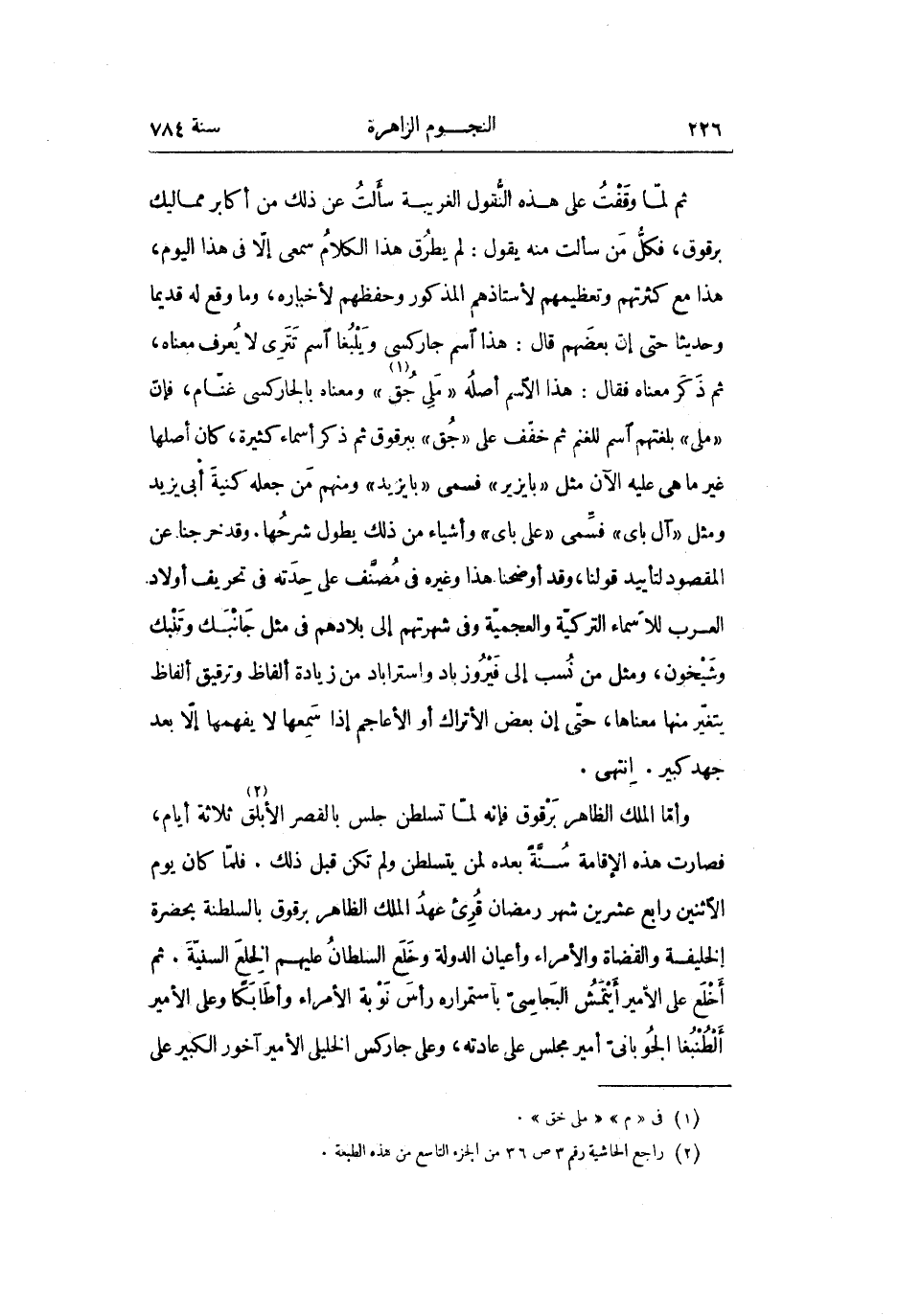 ثم لمّا وقفت على هذه النّقول الغريبة سألت عن ذلك من أكابر مماليك برقوق، فكلّ من سألت منه يقول: لم يطرق هذا الكلام سمعى إلّا في هذا اليوم، هذا مع كثرتهم وتعظيمهم لأستاذهم المذكور وحفظهم لأخياره، وما وقع له قديما وحديثا حتى إنّ بعضهم قال: هذا اسم جاركسى ويلبغا اسم تترى لا يعرف معناه، ثم ذكر معناه فقال: هذا الاسم أصله «ملى جق «1» » ومعناه بالجاركسى غنّام، فإنّ «ملى» بلغتهم اسم للغنم ثم خفّف على «جق» ببرقوق ثم ذكر أسماء كثيرة، كان أصلها غير ما هي عليه الآن مثل «بايزير» فسمى «بايزيد» ومنهم من جعله كنية أبى يزيد ومثل «آل باى» فسّمى «على باى» وأشياء من ذلك يطول شرحها. وقد خرجنا عن المقصود لتأييد قولنا، وقد أوضحنا هذا وغيره في مصنّف على حدته في تحريف أولاد العرب للاسماء التركيّة والعجميّة وفي شهرتهم إلى بلادهم في مثل جانبك وتنبك وشيخون، ومثل من نسب إلى فيروزباد واسترآباد من زيادة ألفاظ وترقيق ألفاظ يتغيّر منها معناها، حتّى إن بعض الأتراك أو الأعاجم إذا سمعها لا يفهمها إلّا بعد جهد كبير. انتهى.