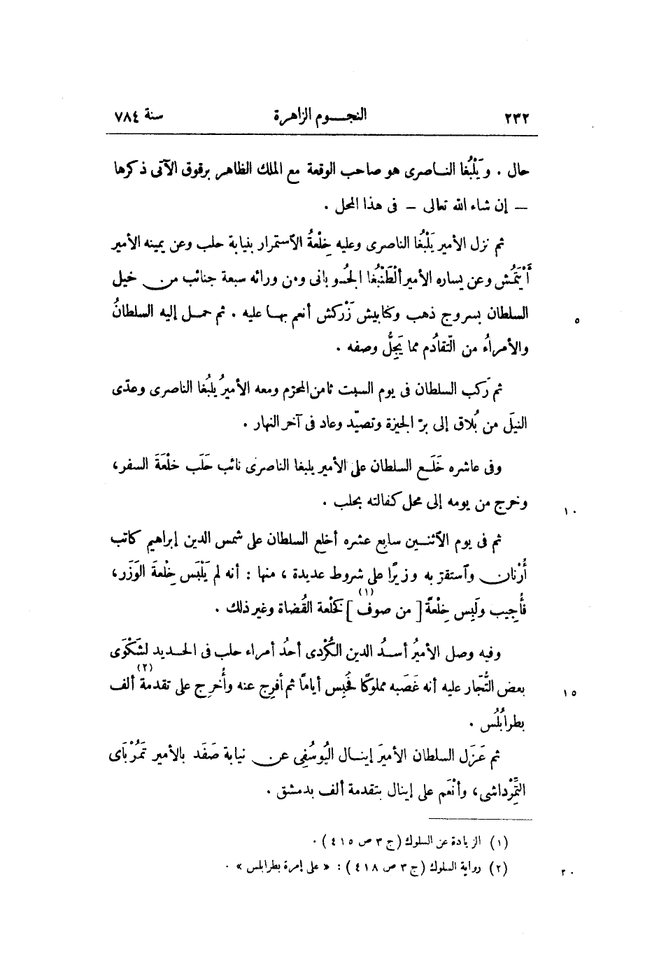 ثم نزل الأمير يلبغا الناصرى وعليه خلعة الاستمرار بنيابة حلب وعن يمينه الأمير أيتمش وعن يساره الأمير ألطنبغا الجوبانى ومن ورائه سبعة جنائب من خيل السلطان بسروج ذهب وكنابيش زركش أنعم بها عليه. ثم حمل إليه السلطان والأمراء من التّقادم مما يجلّ وصفه.