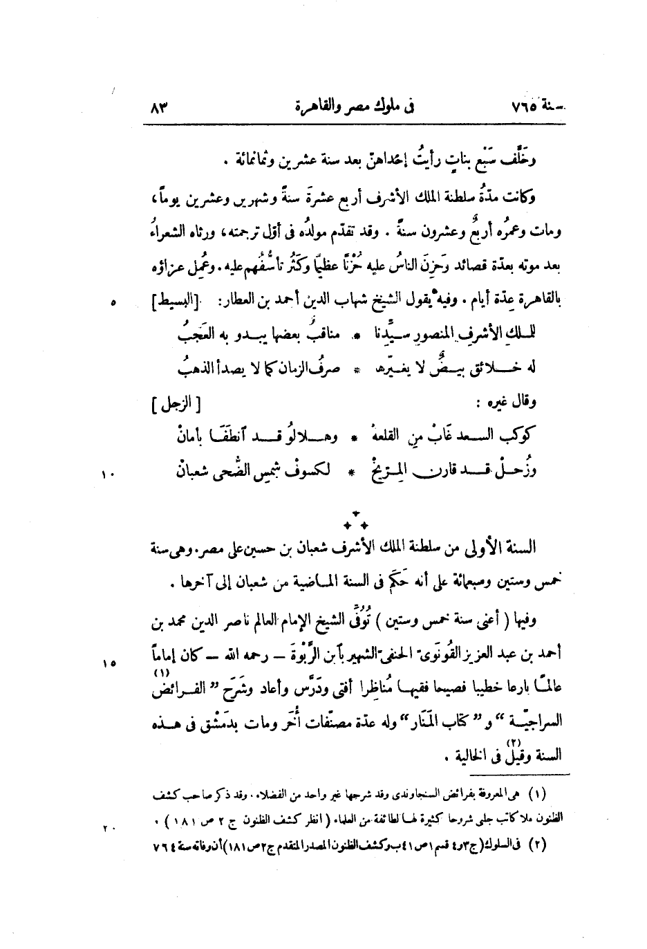 السنة الأولى من سلطنة الملك الأشرف شعبان بن حسين على مصر. وهي سنة خمس وستين وسبعمائة على أنه حكم في السنة الماضية من شعبان إلى آخرها.