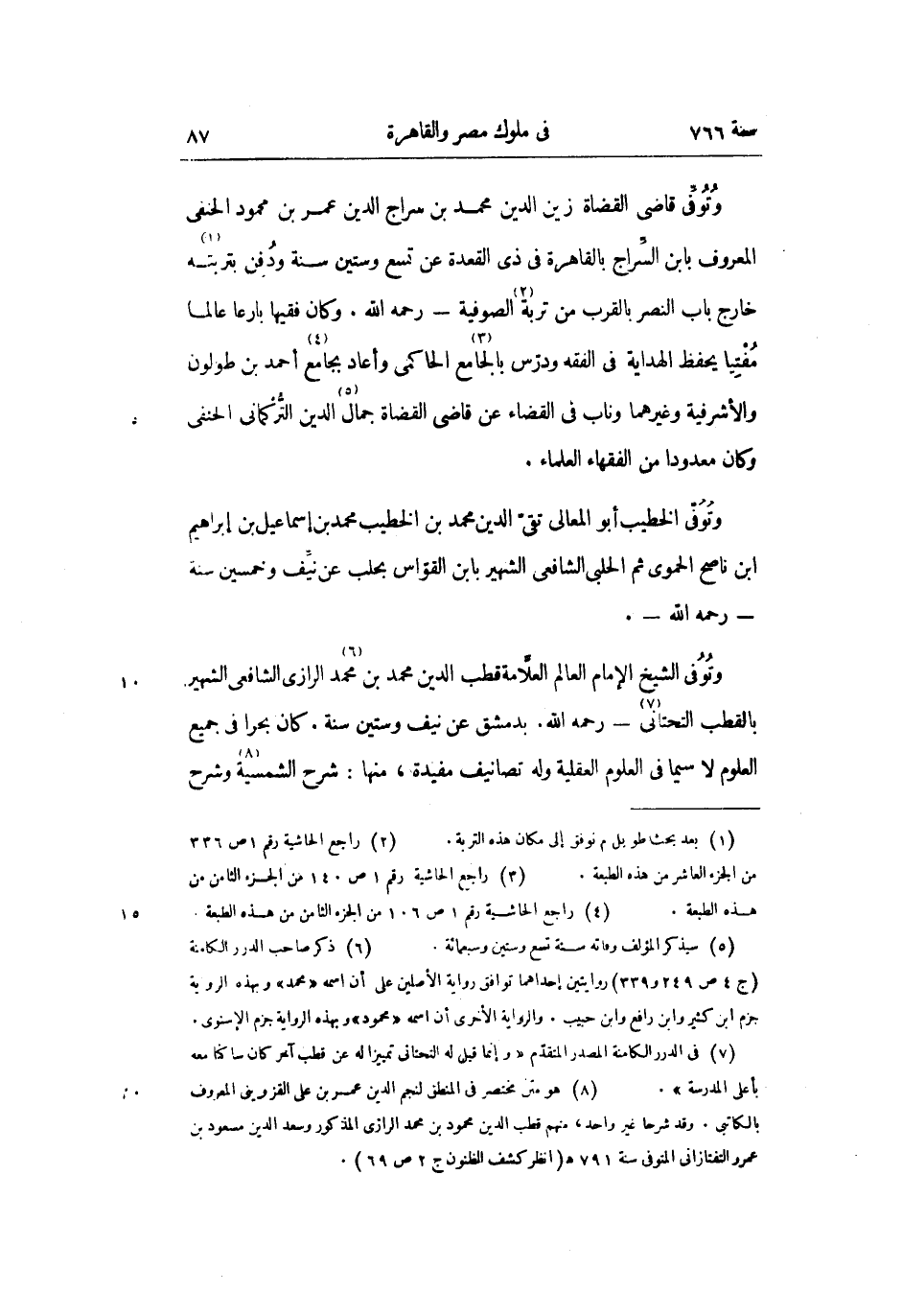 وتوفى الشيخ الإمام العالم العلّامة قطب الدين محمد بن محمد «6» الرازى الشافعى الشهير بالقطب التحتانى «7» - رحمه الله. بدمشق عن نيف وستين سنة. كان بحرا في جميع العلوم لا سيما في العلوم العقلية وله تصانيف مفيدة، منها: شرح الشمسية «8» وشرح