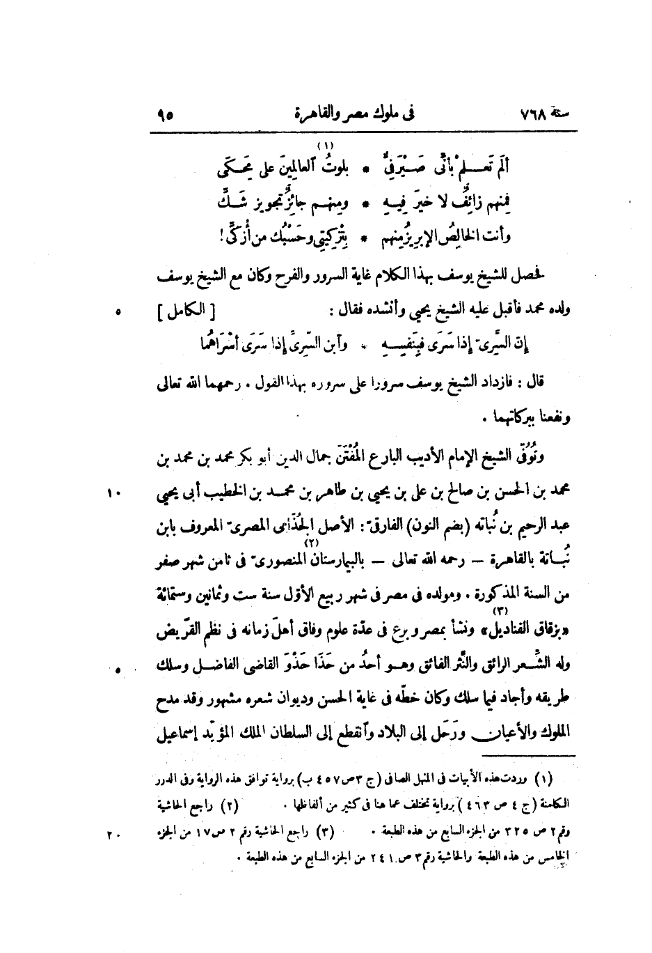 وتوفّى الشيخ الإمام الأديب البارع المفتن جمال الدين أبو بكر محمد بن محمد بن محمد بن الحسن بن صالح بن على بن يحيى بن طاهر بن محمد بن الخطيب أبى يحيى عبد الرحيم بن نباته (بضم النون) الفارقىّ: الأصل الجذامى المصرىّ المعروف بابن نباتة بالقاهرة- رحمه الله تعالى- بالبيمارستان «2» المنصورىّ في ثامن شهر صفر من السنة المذكورة. ومولده في مصر في شهر ربيع الأوّل سنة ست وثمانين وستمائة «بزقاق القناديل «3» » ونشأ بمصر وبرع في عدّة علوم وفاق أهل زمانه في نظم القريض وله الشّعر الرائق والنّثر الفائق وهو أحد من حذا حذو القاضى الفاضل وسلك طريقه وأجاد فيما سلك وكان خطّه في غاية الحسن وديوان شعره مشهور وقد مدح الملوك والأعيان ورحل إلى البلاد وانقطع إلى السلطان الملك المؤيّد إسماعيل
