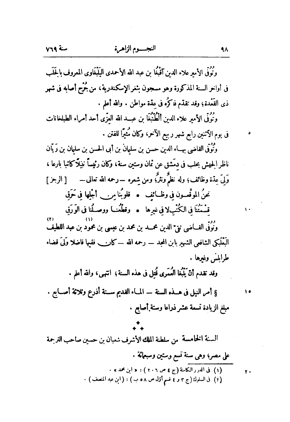 السنة الخامسة من سلطنة الملك الأشرف شعبان بن حسين صاحب الترجمة على مصر؛ وهي سنة تسع وستين وسبعمائة.