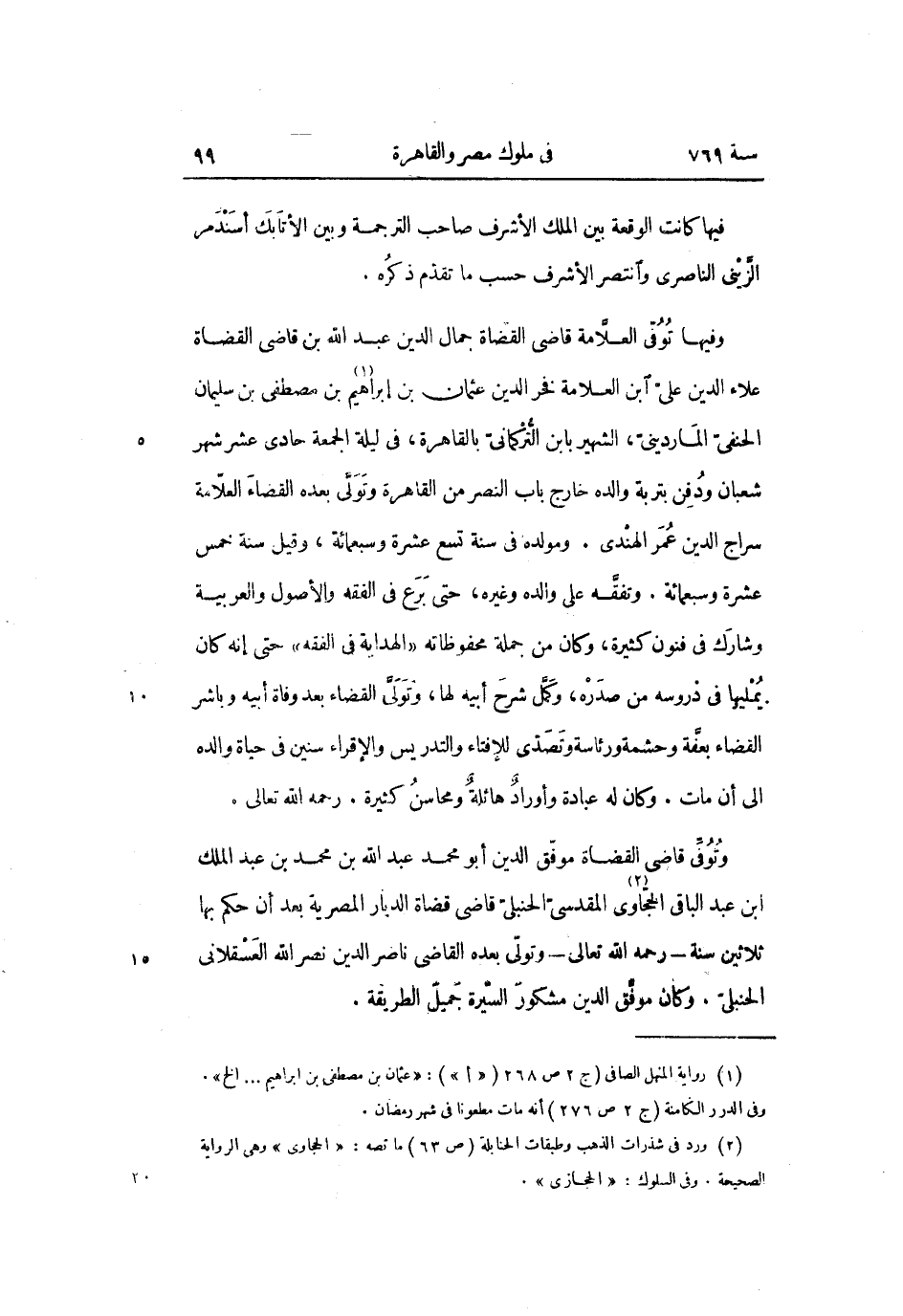 وفيها توفّى العلّامة قاضى القضاة جمال الدين عبد الله بن قاضى القضاة علاء الدين علىّ ابن العلامة فخر الدين عثمان بن إبراهيم «1» بن مصطفى بن سليمان الحنفىّ الماردينىّ، الشهير بابن التّركمانىّ بالقاهرة، فى ليلة الجمعة حادى عشر شهر شعبان ودفن بتربة والده خارج باب النصر من القاهرة وتولّى بعده القضاء العلّامة سراج الدين عمر الهندى. ومولده في سنة تسع عشرة وسبعمائة، وقيل سنة خمس عشرة وسبعمائة. وتفقّه على والده وغيره، حتى برع في الفقه والأصول والعربية وشارك في فنون كثيرة، وكان من جملة محفوظاته «الهداية في الفقه» حتى إنه كان يمليها فى دروسه من صدره، وكمّل شرح أبيه لها، وتولّى القضاء بعد وفاة أبيه وباشر القضاء بعفّة وحشمة ورئاسة وتصدّى للإفتاء والتدريس والإقراء سنين في حياة والده الى أن مات. وكان له عبادة وأوراد هائلة ومحاسن كثيرة. رحمه الله تعالى.