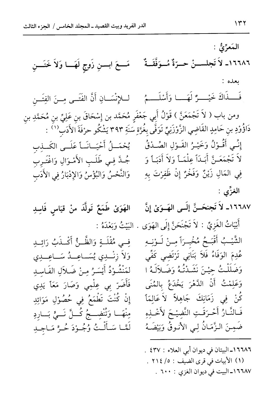 ومن باب (لَا تَجْمَعَنَّ) قَوْلُ أَبِي جَعْفَرٍ مُحَمَّد بن إِسْحَاقَ بنِ عَلِيِّ بنِ مُحَمَّدِ بنِ دَاؤُوْدِ بنِ حَامِدٍ القَاضِي الزَّوْزرنيِّ تَوَفَّى بِغُرَّةِ سَنَةِ 393 يَشْكُو حرْفَةَ الأَدَبِ (¬1):