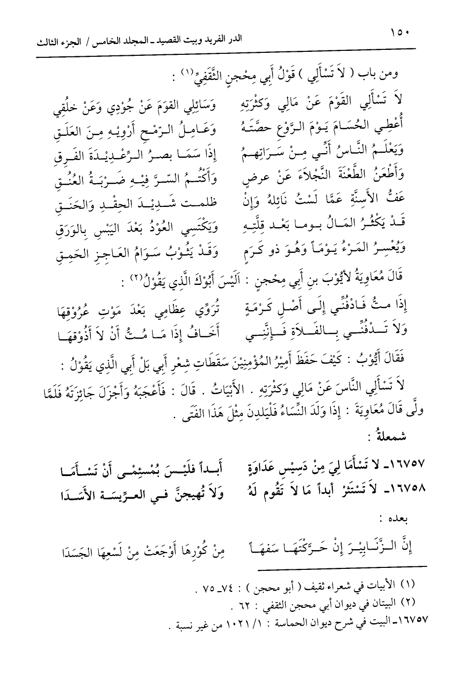 ومن باب (لَا تَسْأَلِي) قَوْلُ أَبِي مِحْجنٍ الثَّقَفِيِّ (¬1):