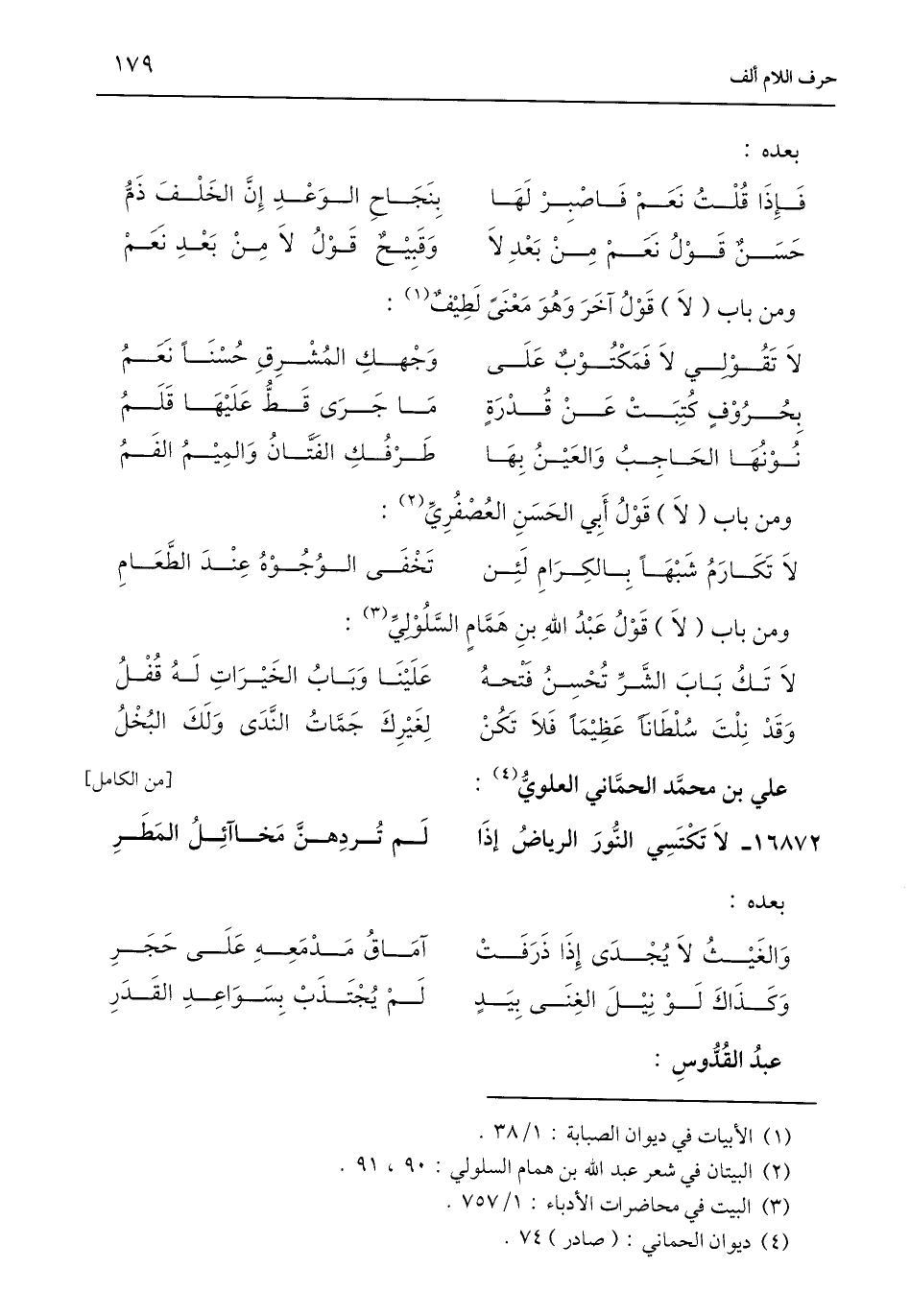 ومن باب (لَا) قَوْلُ عَبْدُ اللَّهِ بنِ هَمَّامٍ السَّلُوْليِّ (¬3):