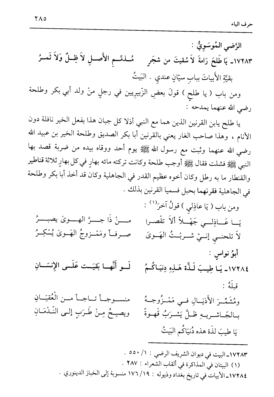 ومن باب (يا طلحٍ) قولَ بعضِ الزّبيرِيين فِي رجلٍ منْ ولد أبي بكر وطلحة رضي اللَّه عنهما يمدحه: