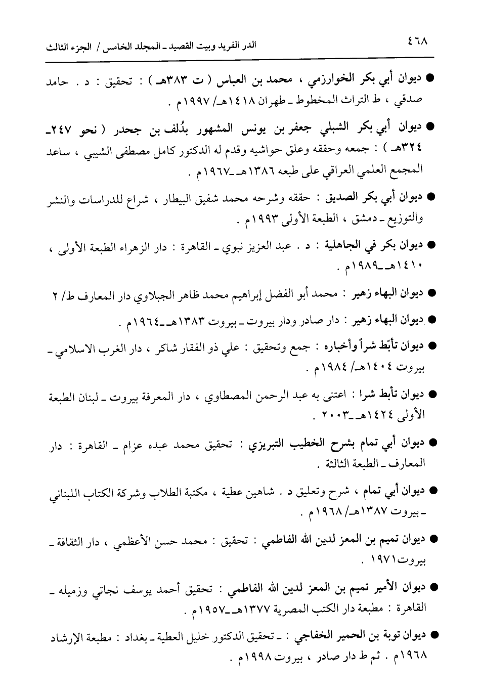 • ديوان أبي بكر الخوارزمي، محمد بن العباس (ت 383 هـ): تحقيق: د. حامد صدقي، ط التراث المخطوط - طهران 1418 هـ / 1997 م. • ديوان أبي بكر الشبلي جعفر بن يونس المشهور بدُلف بن جحدر (نحو 247 - 324 هـ): جمعه وحققه وعلق حواشيه وقدم له الدكتور كامل مصطفى الشيبي، ساعد المجمع العلمي العراقي على طبعه 1386 هـ - 1967 م.