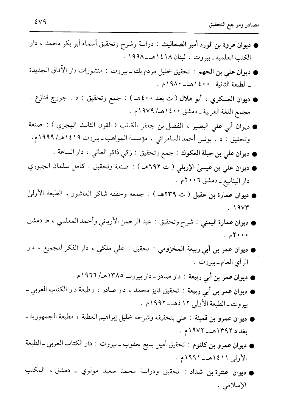 • ديوان عمارة بن عقيل (ت 239 هـ): جمعه وحققه شاكر العاشور، الطبعة الأولى 1973.