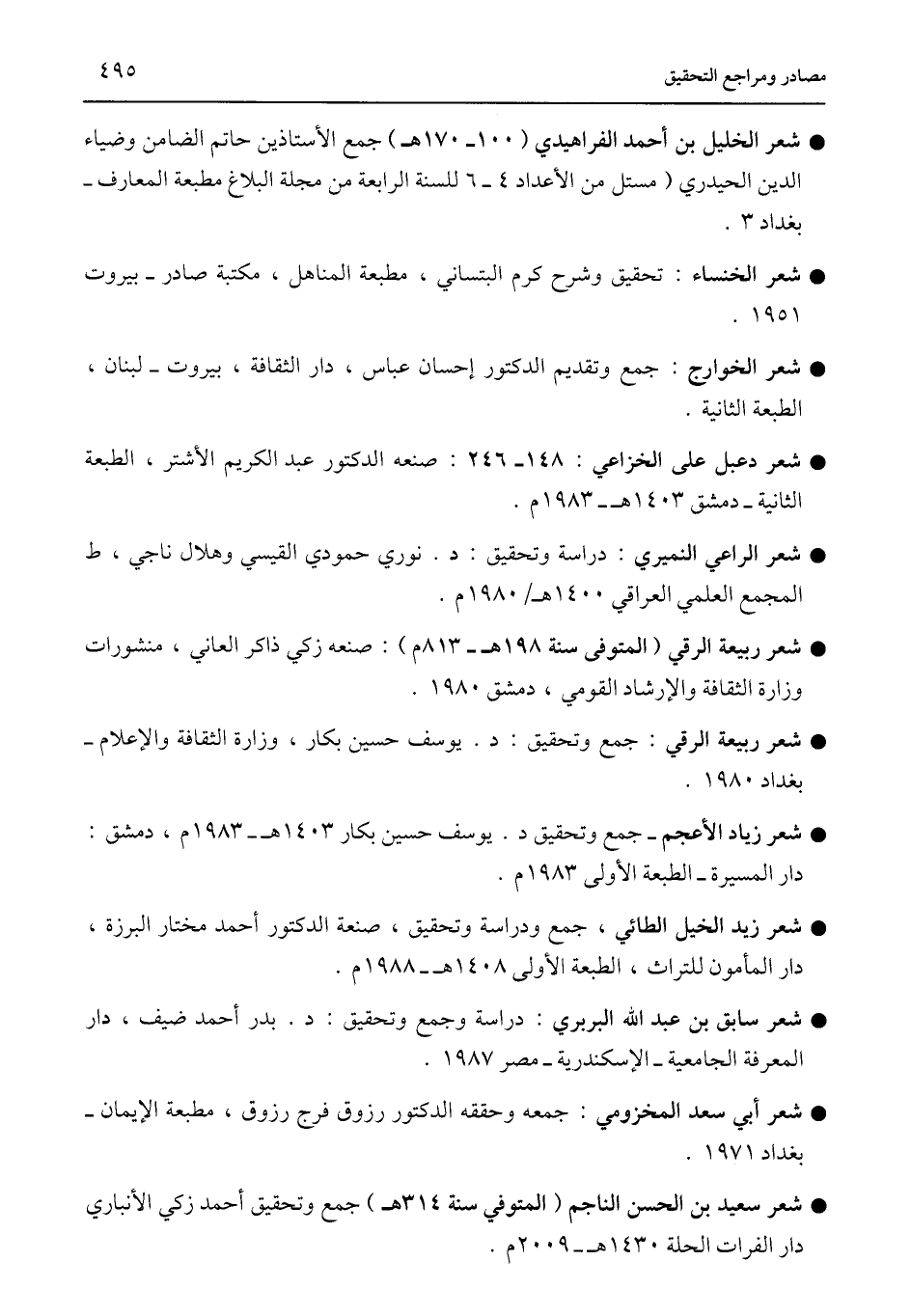 • شعر الخليل بن أحمد الفراهيدي (100 - 170 هـ) جمع الأستاذين حاتم الضامن وضياء الدين الحيدري (مستل من الأعداد 4 - 6 للسنة الرابعة من مجلة البلاغ مطبعة المعارف - بغداد 3.