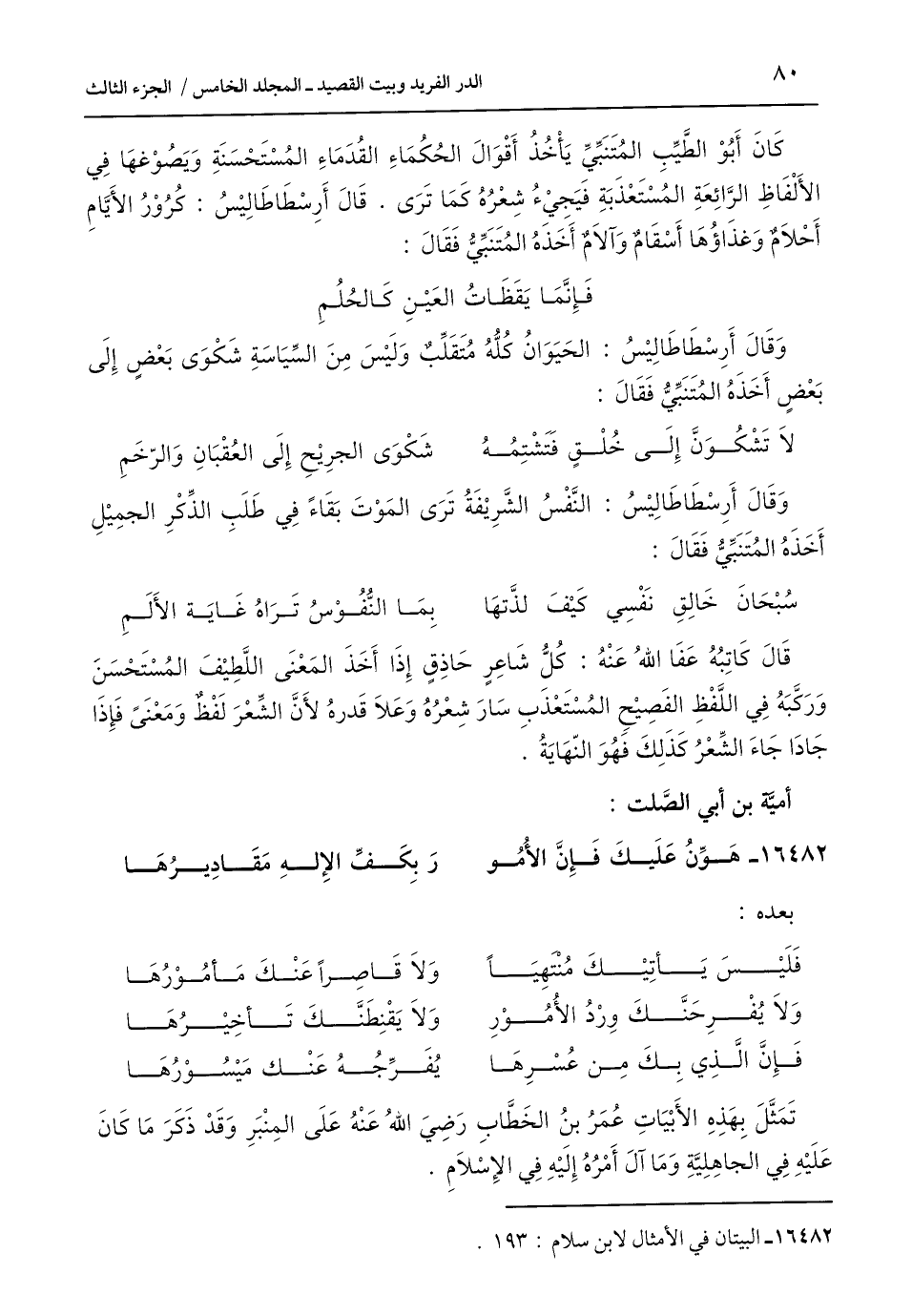 كَانَ أَبُوْ الطَّيِّبِ المُتَنَبِّيِّ يَأْخُذُ أَقْوَالَ الحُكُمَاءِ القُدَمَاءِ المُسْتَحْسَنَةِ وَيَصُوْغهَا في الأَلْفَاظِ الرَّائِعَةِ المُسْتَعْذَبَةِ فَيَجِيْءُ شِعْرُهُ كَمَا تَرَى. قَالَ أَرِسطَاطَالِيْسُ: كُرُوْرُ الأَيَّام أَحْلَامٌ وَغذَاؤُهَا أَسْقَامٌ وَآلَامٌ أَخَذَهُ المُتَنَبِّيُّ فَقَالَ: