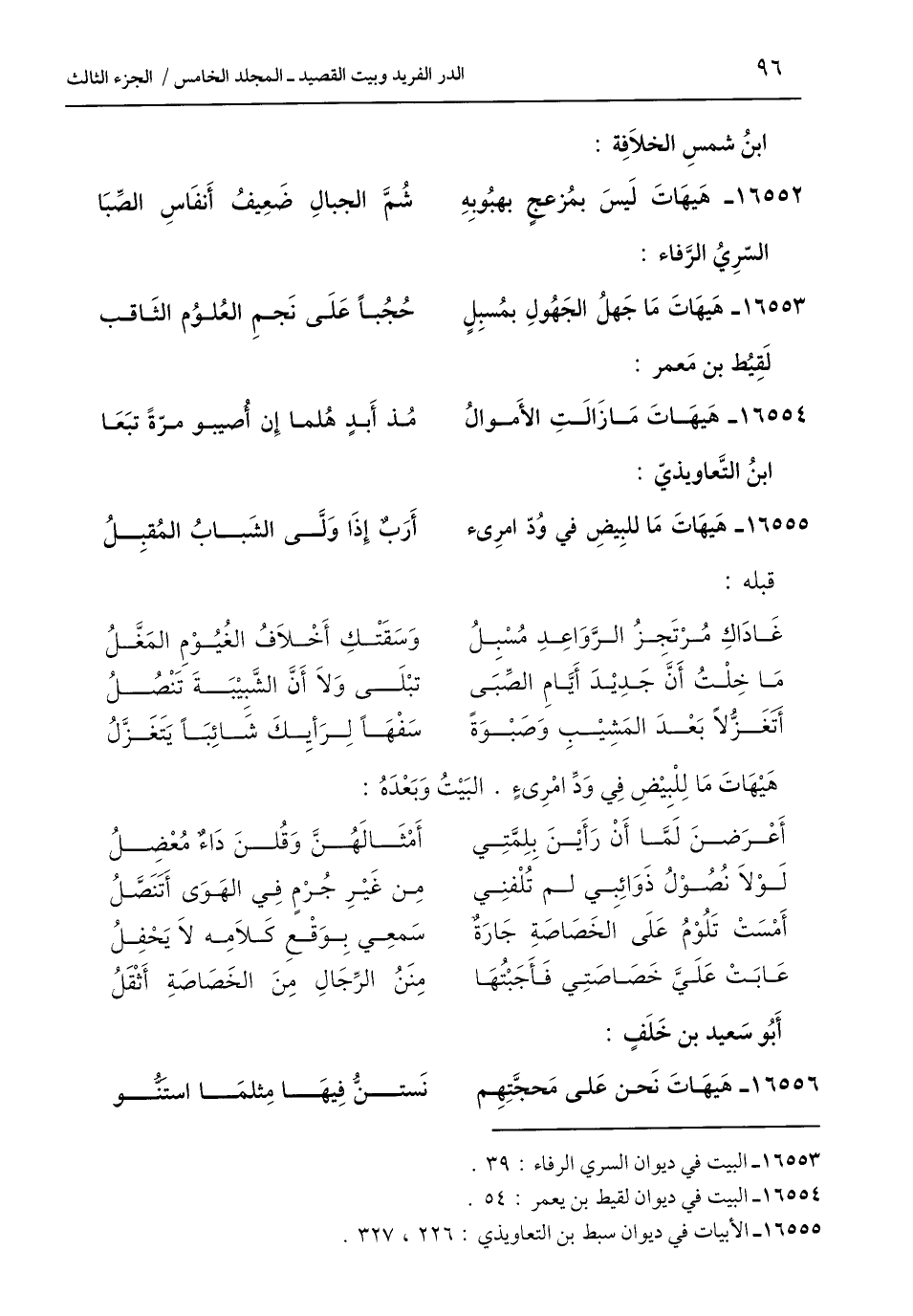 هَيْهَاتَ مَا لِلْبِيْضِ في وَدِّ امْرِئٍ. البَيْتُ وَبَعْدَهُ: