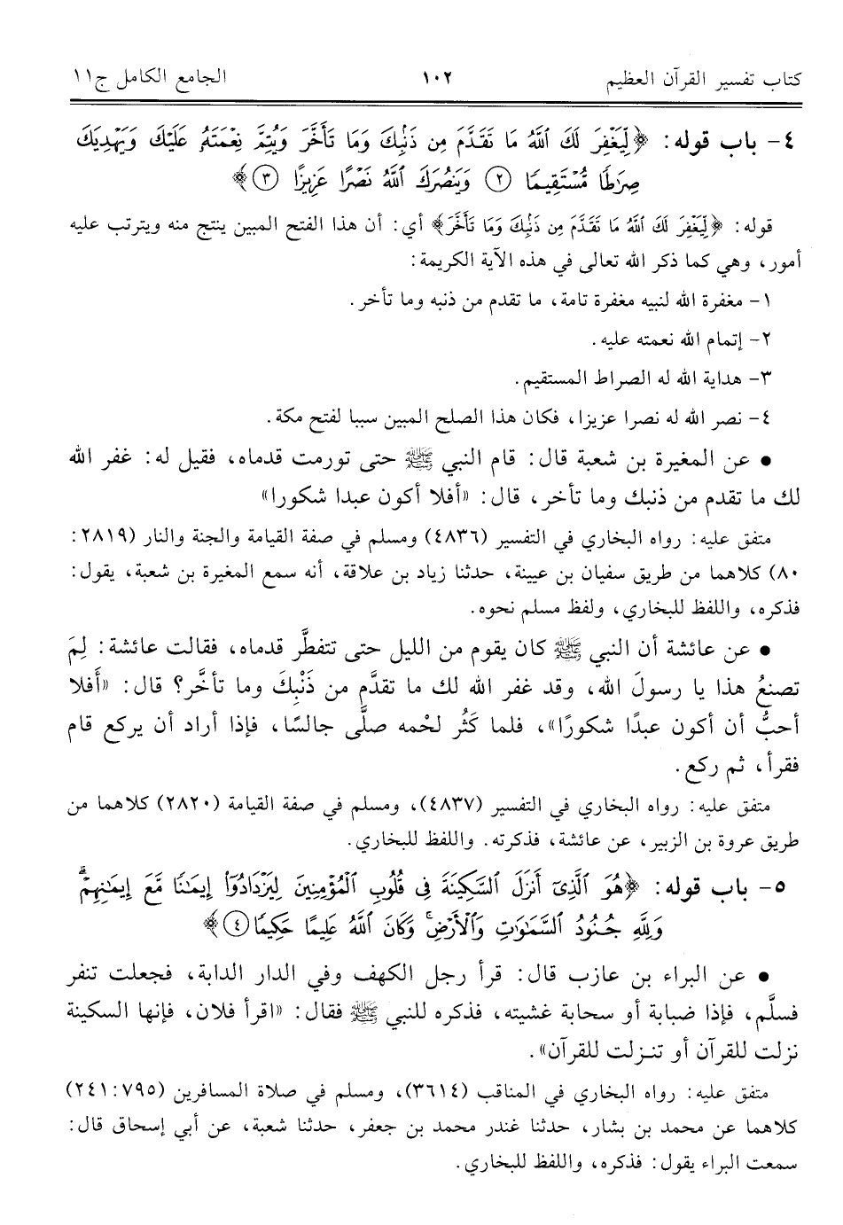 ٤ - باب قوله: {لِيَغْفِرَ لَكَ اللَّهُ مَا تَقَدَّمَ مِنْ ذَنْبِكَ وَمَا تَأَخَّرَ وَيُتِمَّ نِعْمَتَهُ عَلَيْكَ وَيَهْدِيَكَ صِرَاطًا مُسْتَقِيمًا (٢) وَيَنْصُرَكَ اللَّهُ نَصْرًا عَزِيزًا (٣)}