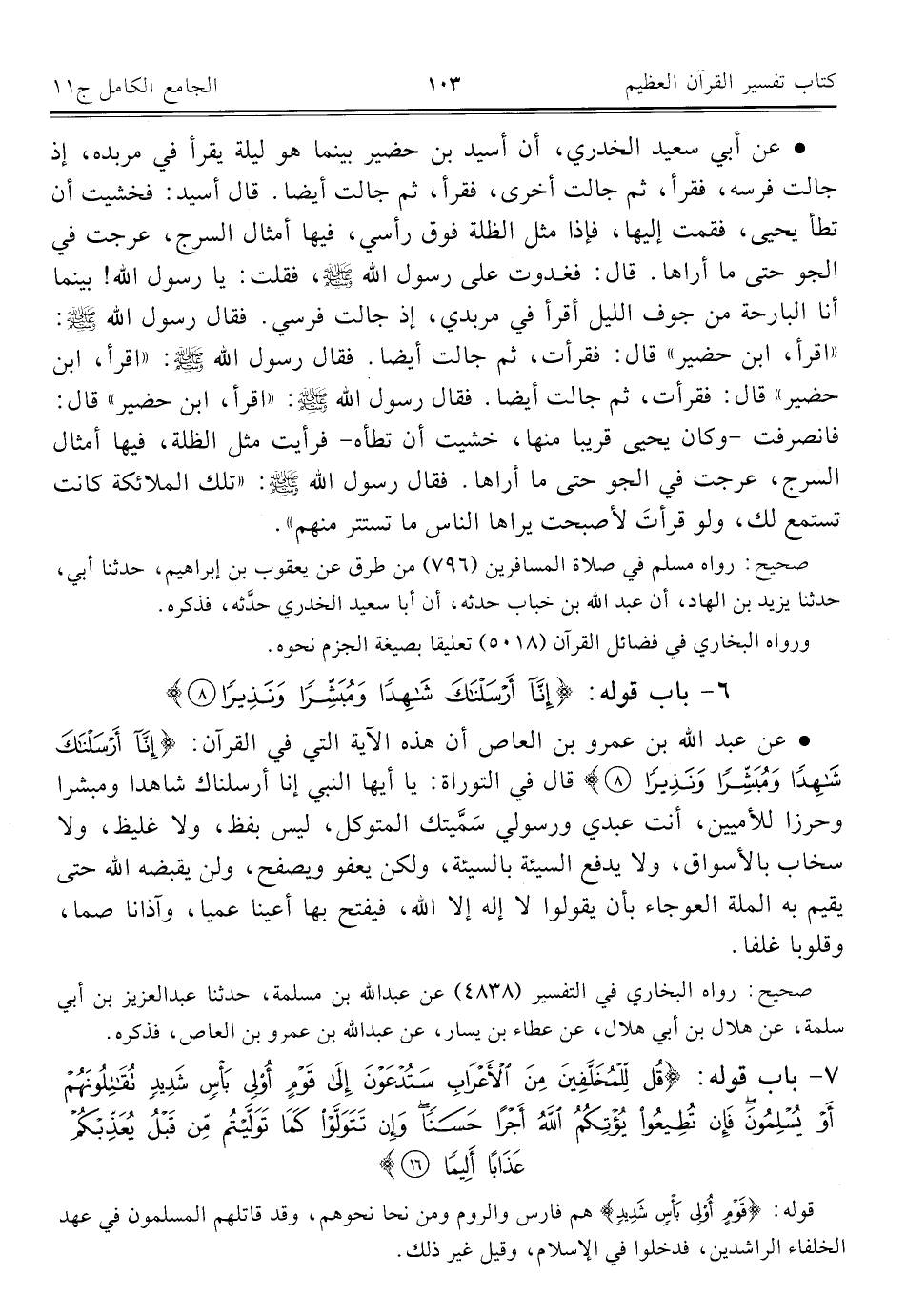 ٦ - باب قوله: {إِنَّا أَرْسَلْنَاكَ شَاهِدًا وَمُبَشِّرًا وَنَذِيرًا (٨)}