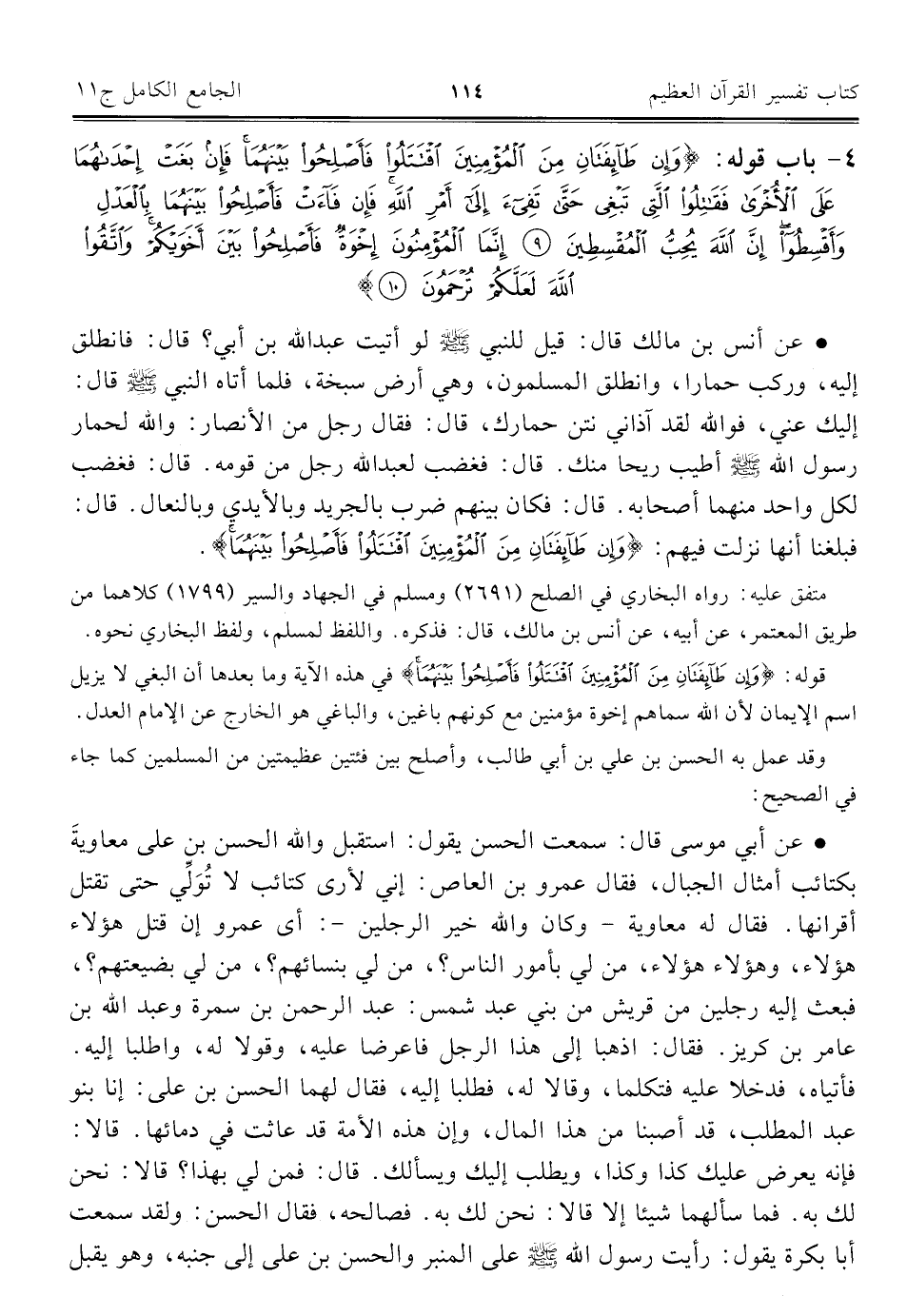 ٤ - باب قوله: {وَإِنْ طَائِفَتَانِ مِنَ الْمُؤْمِنِينَ اقْتَتَلُوا فَأَصْلِحُوا بَيْنَهُمَا فَإِنْ بَغَتْ إِحْدَاهُمَا عَلَى الْأُخْرَى فَقَاتِلُوا الَّتِي تَبْغِي حَتَّى تَفِيءَ إِلَى أَمْرِ اللَّهِ فَإِنْ فَاءَتْ فَأَصْلِحُوا بَيْنَهُمَا بِالْعَدْلِ وَأَقْسِطُوا إِنَّ اللَّهَ يُحِبُّ الْمُقْسِطِينَ (٩) إِنَّمَا الْمُؤْمِنُونَ إِخْوَةٌ فَأَصْلِحُوا بَيْنَ أَخَوَيْكُمْ وَاتَّقُوا اللَّهَ لَعَلَّكُمْ تُرْحَمُونَ (١٠)}
