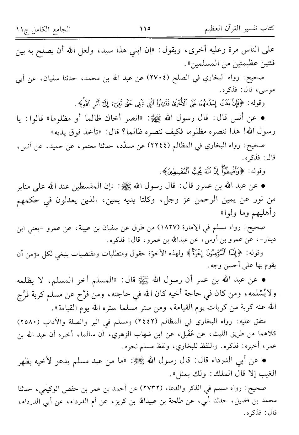 • عن عبد الله بن عمر أن رسول الله - صلى الله عليه وسلم - قال: "المسلم أخو المسلم، لا يظلمه ولا يُسْلمه، ومن كان في حاجة أخيه كان الله في حاجته، ومن فرَّج عن مسلم كربة فرَّج الله عنه كربة من كربات يوم القيامة، ومن ستر مسلما ستره الله يوم القيامة".