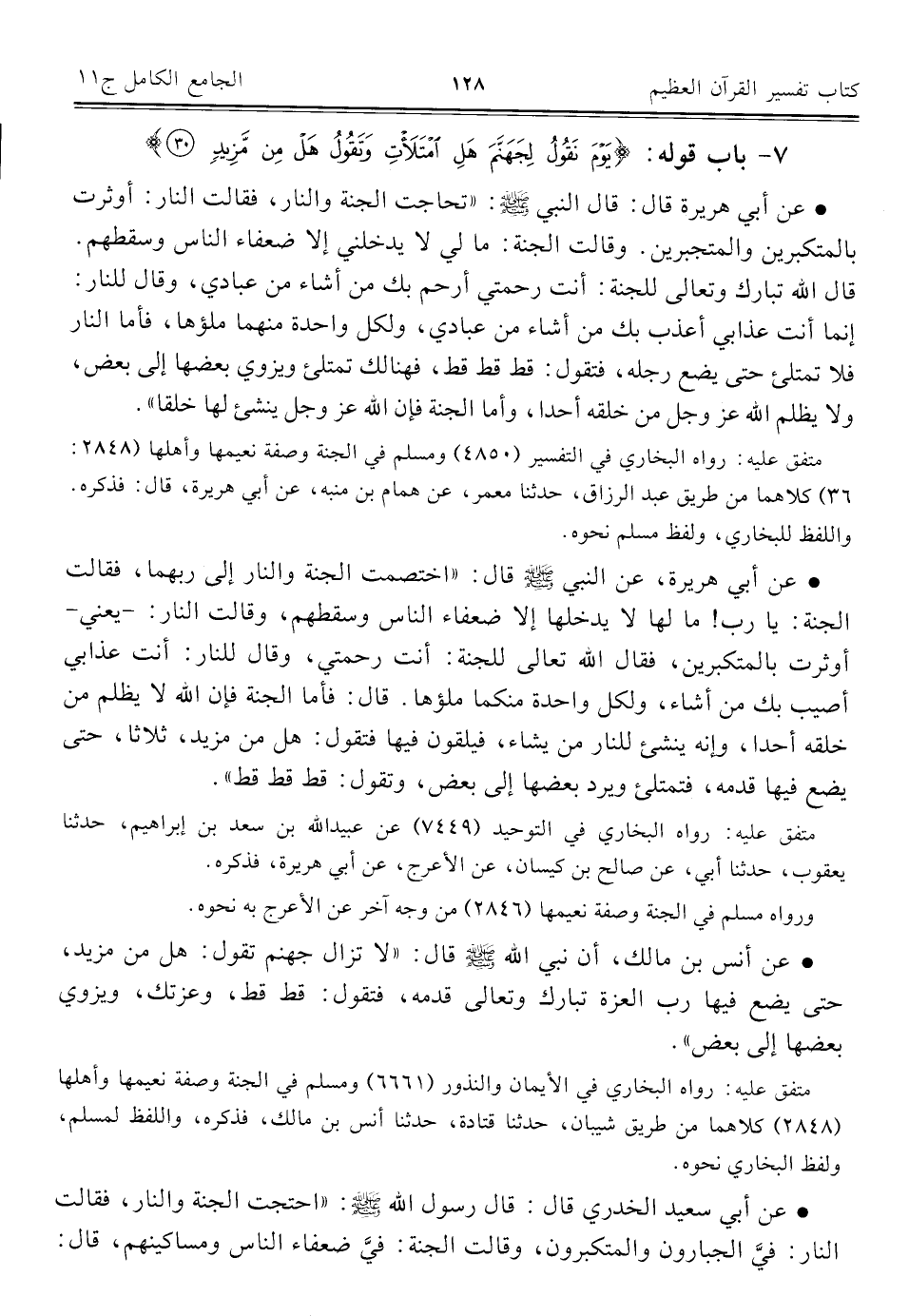 ٧ - باب قوله: {يَوْمَ نَقُولُ لِجَهَنَّمَ هَلِ امْتَلأْتِ وَتَقُولُ هَلْ مِنْ مَزِيدٍ (٣٠)}
