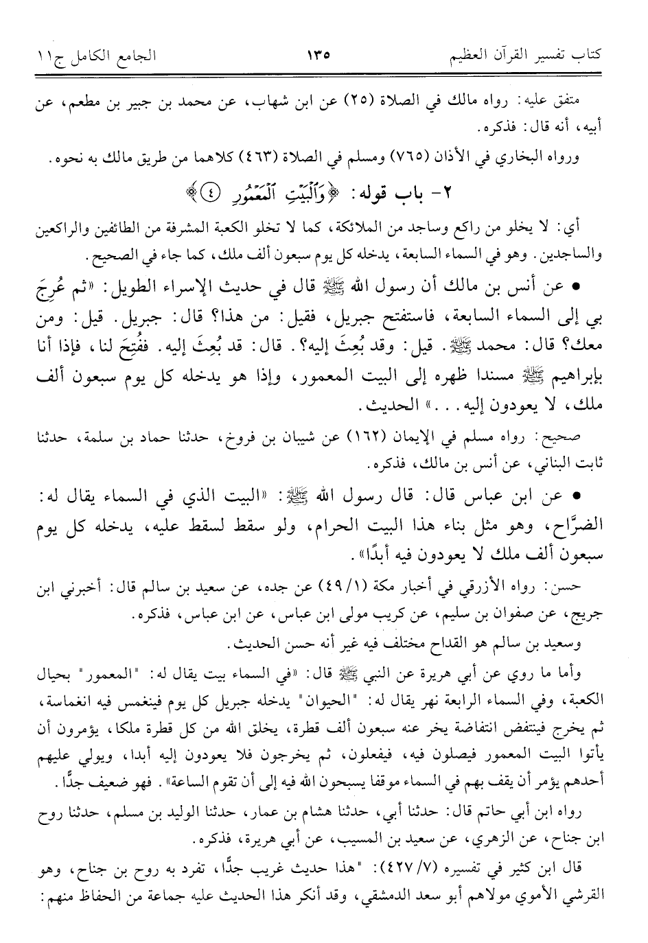 وأما ما روي عن أبي هريرة عن النبي - صلى الله عليه وسلم - قال: "في السماء بيت يقال له: "المعمور" بحيال الكعبة، وفي السماء الرابعة نهر يقال له: "الحيوان" يدخله جبريل كل يوم فينغمس فيه انغماسة، ثم يخرج فينتفض انتفاضة يخر عنه سبعون ألف قطرة، يخلق الله من كل قطرة ملكا، يؤمرون أن يأتوا البيت المعمور فيصلون فيه، فيفعلون، ثم يخرجون فلا يعودون إليه أبدا، ويولي عليهم أحدهم يؤمر أن يقف بهم في السماء موقفا يسبحون الله فيه إلى أن تقوم الساعة". فهو ضعيف جدًّا.