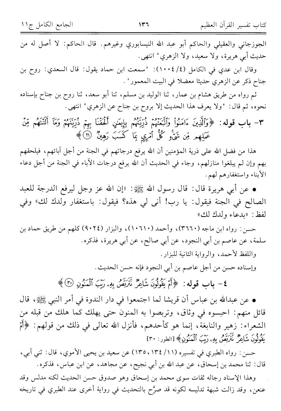 ٣ - باب قوله: {وَالَّذِينَ آمَنُوا وَاتَّبَعَتْهُمْ ذُرِّيَّتُهُمْ بِإِيمَانٍ أَلْحَقْنَا بِهِمْ ذُرِّيَّتَهُمْ وَمَا أَلَتْنَاهُمْ مِنْ عَمَلِهِمْ مِنْ شَيْءٍ كُلُّ امْرِئٍ بِمَا كَسَبَ رَهِينٌ (٢١)}