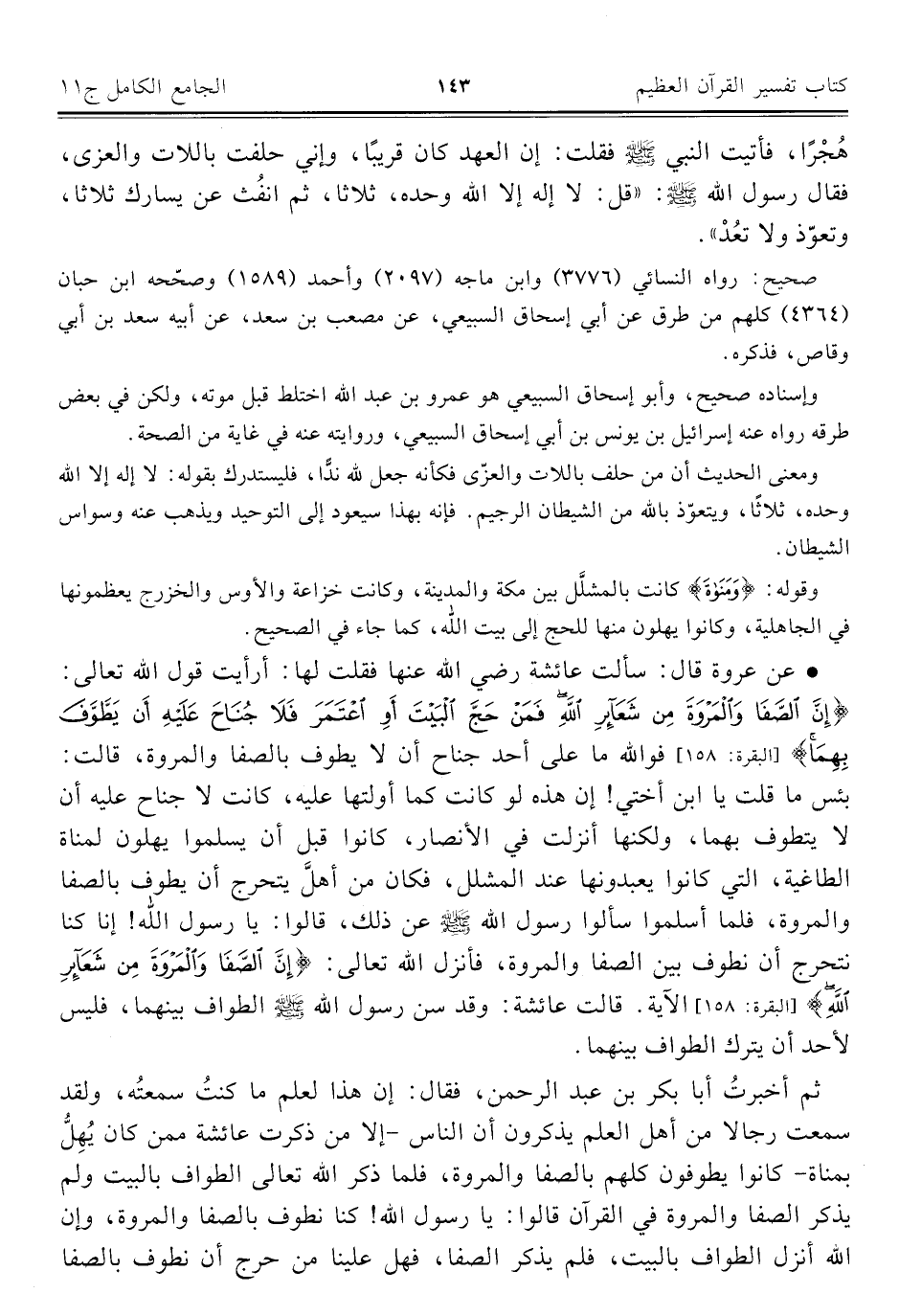 • عن عروة قال: سألت عائشة رضي الله عنها فقلت لها: أرأيت قول الله تعالى: {إِنَّ الصَّفَا وَالْمَرْوَةَ مِنْ شَعَائِرِ اللَّهِ فَمَنْ حَجَّ الْبَيْتَ أَوِ اعْتَمَرَ فَلَا جُنَاحَ عَلَيْهِ أَنْ يَطَّوَّفَ بِهِمَا} [البقرة: ١٥٨] فوالله ما على أحد جناح أن لا يطوف بالصفا والمروة، قالت: بئس ما قلت يا ابن أختي! إن هذه لو كانت كما أولتها عليه، كانت لا جناح عليه أن لا يتطوف بهما، ولكنها أنزلت في الأنصار، كانوا قبل أن يسلموا يهلون لمناة الطاغية، التي كانوا يعبدونها عند المشلل، فكان من أهلَّ يتحرج أن يطوف بالصفا والمروة، فلما أسلموا سألوا رسول الله - صلى الله عليه وسلم - عن ذلك، قالوا: يا رسول الله! إنا كنا نتحرج أن نطوف بين الصفا والمروة، فأنزل الله تعالى: {إِنَّ الصَّفَا وَالْمَرْوَةَ مِنْ شَعَائِرِ اللَّهِ} [البقرة: ١٥٨] الآية. قالت عائشة: وقد سن رسول الله - صلى الله عليه وسلم - الطواف بينهما، فليس لأحد أن يترك الطواف بينهما.