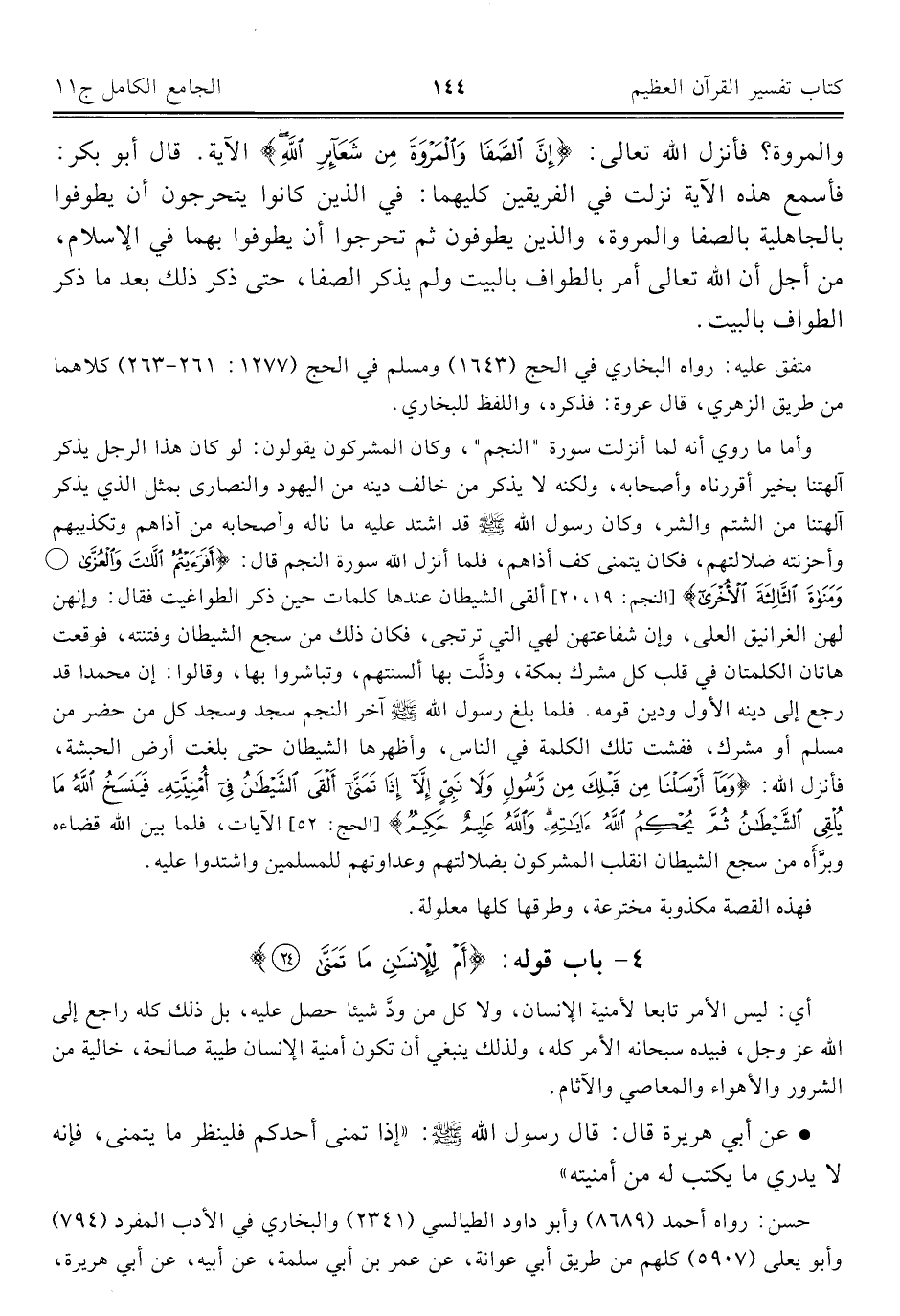 وأما ما روي أنه لما أنزلت سورة "النجم"، وكان المشركون يقولون: لو كان هذا الرجل يذكر آلهتنا بخير أقررناه وأصحابه، ولكنه لا يذكر من خالف دينه من اليهود والنصارى بمثل الذي يذكر آلهتنا من الشتم والشر، وكان رسول الله - صلى الله عليه وسلم - قد اشتد عليه ما ناله وأصحابه من أذاهم وتكذيبهم وأحزنته ضلالتهم، فكان يتمنى كف أذاهم، فلما أنزل الله سورة النجم قال: {أَفَرَأَيْتُمُ اللَّاتَ وَالْعُزَّى (١٩) وَمَنَاةَ الثَّالِثَةَ الْأُخْرَى} [النجم: ١٩، ٢٠] ألقى الشيطان عندها كلمات حين ذكر الطواغيت فقال: وإنهن لهن الغرانيق العلى، وإن شفاعتهن لهي التي ترتجى، فكان ذلك من سجع الشيطان وفتنته، فوقعت هاتان الكلمتان في قلب كل مشرك بمكة، وذلَّت بها ألسنتهم، وتباشروا بها، وقالوا: إن محمدا قد رجع إلى دينه الأول ودين قومه. فلما بلغ رسول الله - صلى الله عليه وسلم - آخر النجم سجد وسجد كل من حضر من مسلم أو مشرك، ففشت تلك الكلمة في الناس، وأظهرها الشيطان حتى بلغت أرض الحبشة، فأنزل الله: {وَمَا أَرْسَلْنَا مِنْ قَبْلِكَ مِنْ رَسُولٍ وَلَا نَبِيٍّ إِلَّا إِذَا تَمَنَّى أَلْقَى الشَّيْطَانُ فِي أُمْنِيَّتِهِ فَيَنْسَخُ اللَّهُ مَا يُلْقِي الشَّيْطَانُ ثُمَّ يُحْكِمُ اللَّهُ آيَاتِهِ وَاللَّهُ عَلِيمٌ حَكِيمٌ} [الحج: ٥٢] الآيات، فلما بين الله قضاءه وبرَّأَه من سجع الشيطان انقلب المشركون بضلالتهم وعداوتهم للمسلمين واشتدوا عليه.