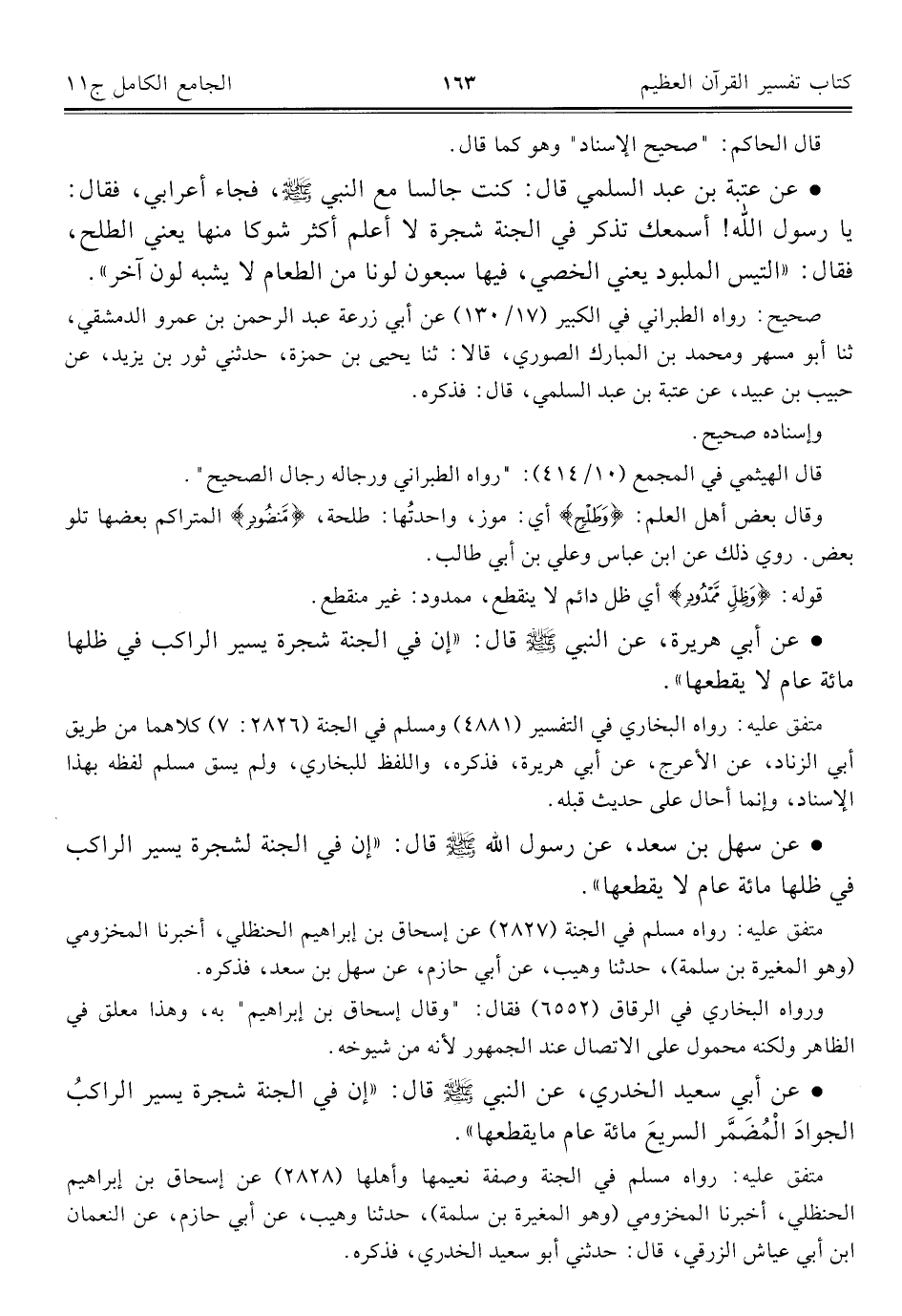 • عن أبي سعيد الخدري، عن النبي - صلى الله عليه وسلم - قال: "إن في الجنة شجرة يسير الراكبُ الجوادَ الْمُضمَّر السريعَ مائة عام ما يقطعها".