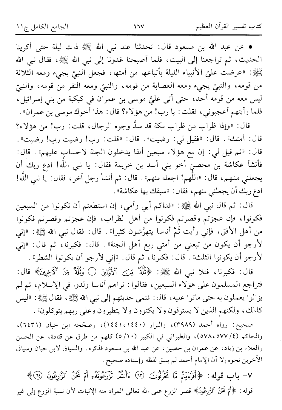 قال: فكبرنا، فتلا نبي الله - صلى الله عليه وسلم -: {ثُلَّةٌ مِنَ الْأَوَّلِينَ * وَثُلَّةٌ مِنَ الْآخِرِينَ} قال: فتراجع المسلمون على هؤلاء السبعين، فقالوا: نراهم أناسا ولدوا في الإسلام، ثم لم يزالوا يعملون به حتى ماتوا عليه، قال: فنمى حديثهم إلى نبي الله - صلى الله عليه وسلم -، فقال - صلى الله عليه وسلم -: "ليس كذلك، ولكنهم الذين لا يسترقون ولا يكتوون ولا يتطيرون وعلى ربهم يتوكلون".
