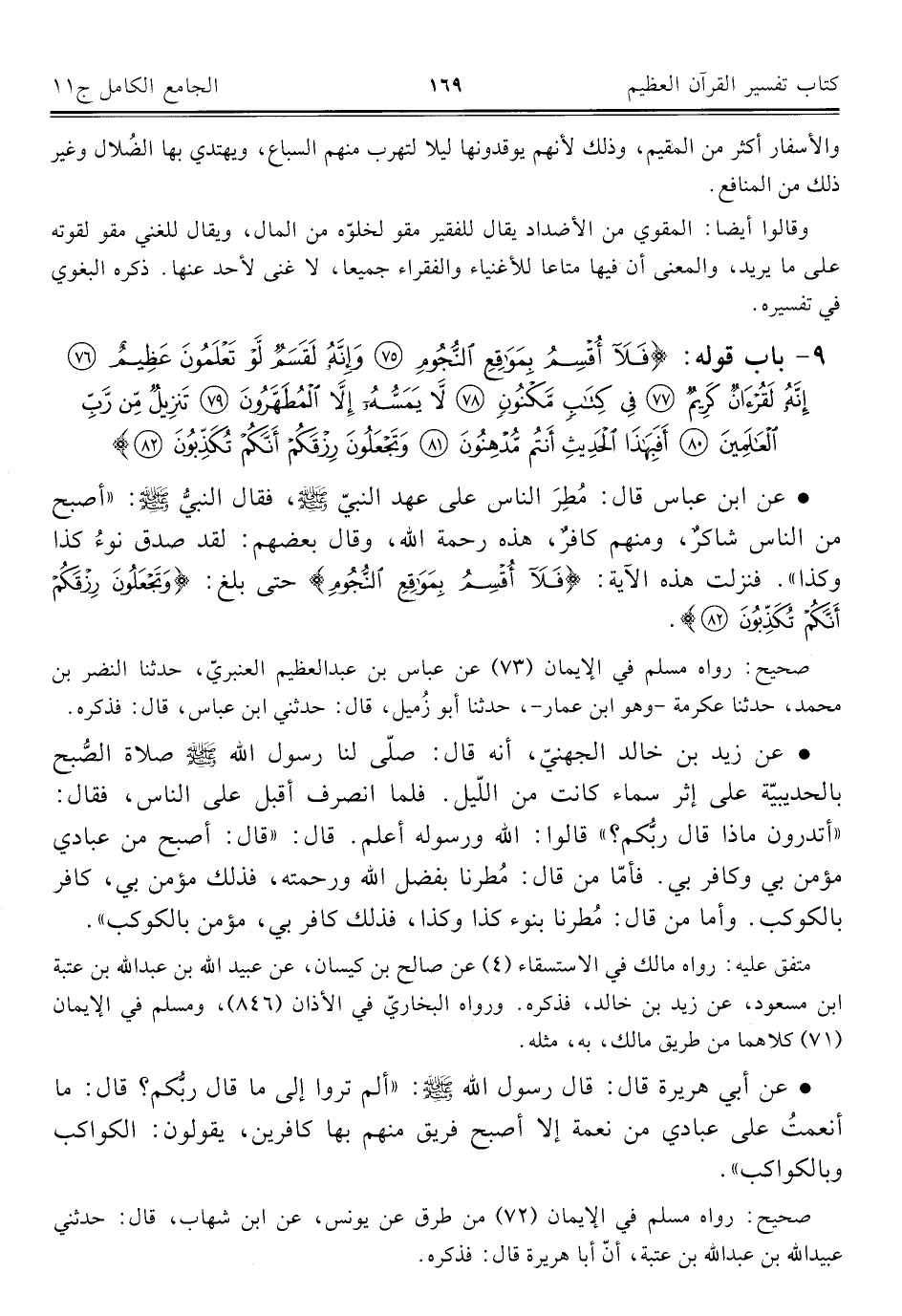 ٩ - باب قوله: {فَلَا أُقْسِمُ بِمَوَاقِعِ النُّجُومِ (٧٥) وَإِنَّهُ لَقَسَمٌ لَوْ تَعْلَمُونَ عَظِيمٌ (٧٦) إِنَّهُ لَقُرْآنٌ كَرِيمٌ (٧٧) فِي كِتَابٍ مَكْنُونٍ (٧٨) لَا يَمَسُّهُ إِلَّا الْمُطَهَّرُونَ (٧٩) تَنْزِيلٌ مِنْ رَبِّ الْعَالَمِينَ (٨٠) أَفَبِهَذَا الْحَدِيثِ أَنْتُمْ مُدْهِنُونَ (٨١) وَتَجْعَلُونَ رِزْقَكُمْ أَنَّكُمْ تُكَذِّبُونَ (٨٢)}