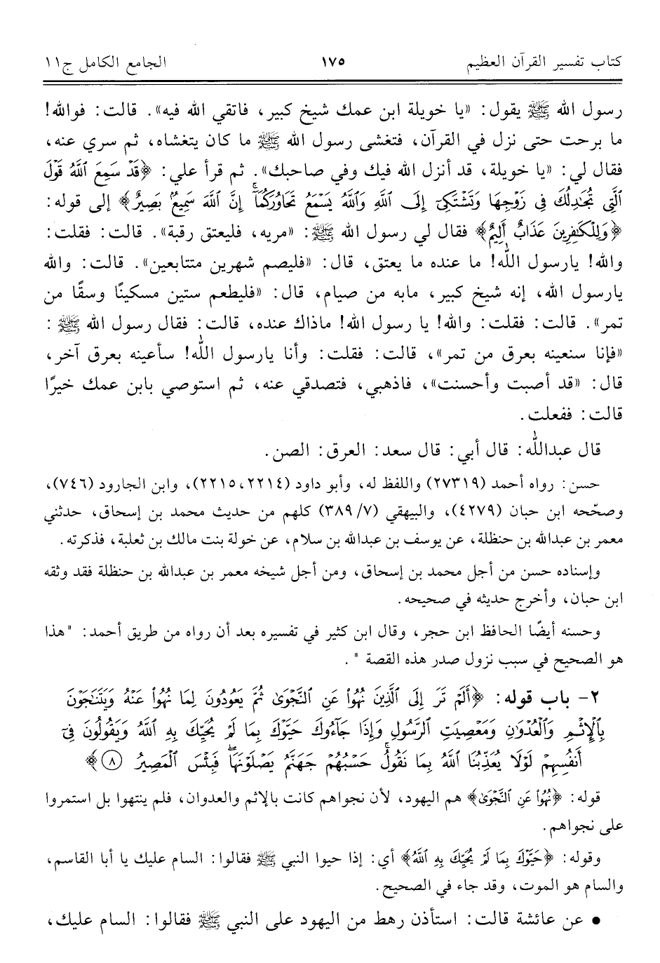 رسول الله - صلى الله عليه وسلم - يقول: "يا خويلة ابن عمك شيخ كبير، فاتقي الله فيه". قالت: فوالله! ما برحت حتى نزل في القرآن، فتغشى رسول الله - صلى الله عليه وسلم - ما كان يتغشاه، ثم سري عنه، فقال لي: "يا خويلة، قد أنزل الله فيك وفي صاحبك". ثم قرأ علي: {قَدْ سَمِعَ اللَّهُ قَوْلَ الَّتِي تُجَادِلُكَ فِي زَوْجِهَا وَتَشْتَكِي إِلَى اللَّهِ وَاللَّهُ يَسْمَعُ تَحَاوُرَكُمَا إِنَّ اللَّهَ سَمِيعٌ بَصِيرٌ} إلى قوله: {وَلِلْكَافِرِينَ عَذَابٌ أَلِيمٌ} فقال لي رسول الله - صلى الله عليه وسلم -: "مريه، فليعتق رقبة". قالت: فقلت: والله! يا رسول الله! ما عنده ما يعتق، قال: "فليصم شهرين متتابعين". قالت: والله يا رسول الله، إنه شيخ كبير، ما به من صيام، قال: "فليطعم ستين مسكينًا وسقًا من تمر". قالت: فقلت: والله! يا رسول الله! ما ذاك عنده، قالت: فقال رسول الله - صلى الله عليه وسلم -: "فإنا سنعينه بعرق من تمر"، قالت: فقلت: وأنا يا رسول الله! سأعينه بعرق آخر، قال: "قد أصبت وأحسنت"، فاذهبي، فتصدقي عنه، ثم استوصي بابن عمك خيرًا قالت: ففعلت.