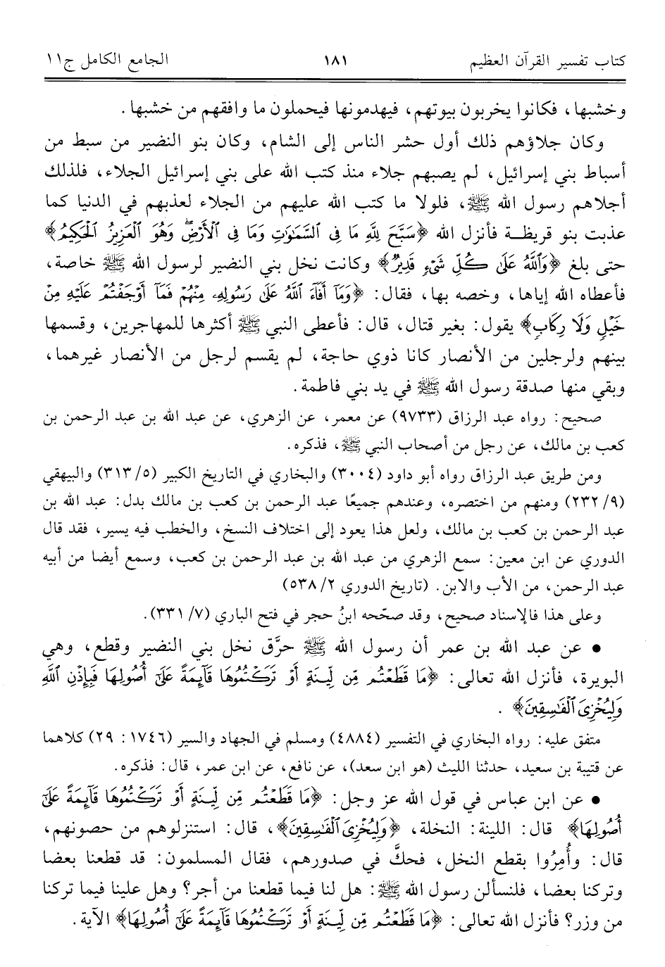 • عن عبد الله بن عمر أن رسول الله - صلى الله عليه وسلم - حرَّق نخل بني النضير وقطع، وهي البويرة، فأنزل الله تعالى: {مَا قَطَعْتُمْ مِنْ لِينَةٍ أَوْ تَرَكْتُمُوهَا قَائِمَةً عَلَى أُصُولِهَا فَبِإِذْنِ اللَّهِ وَلِيُخْزِيَ الْفَاسِقِينَ}.