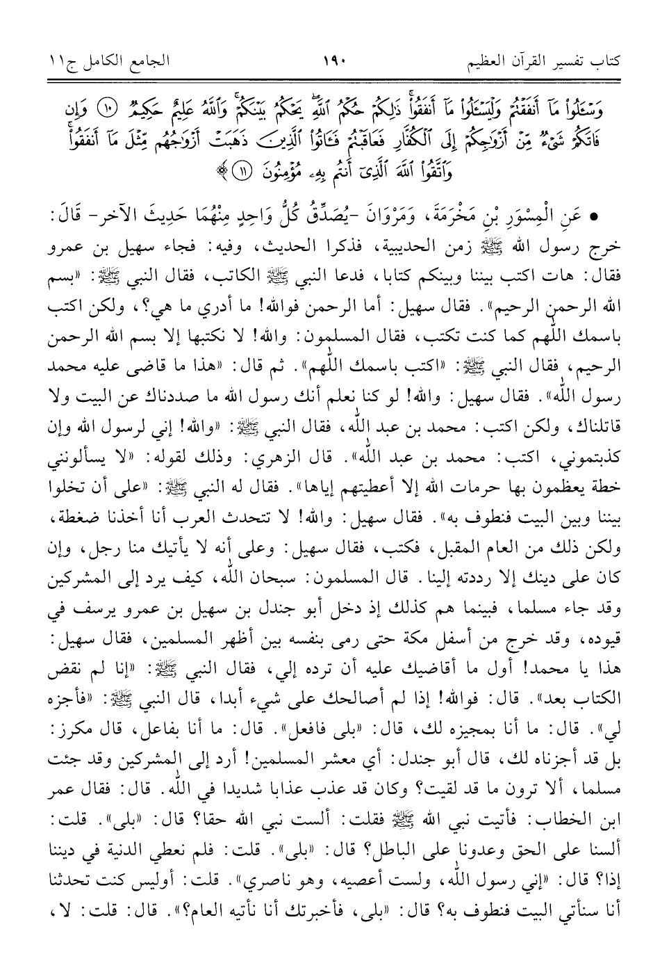 • عَن الْمِسْوَرِ بْنِ مَخْرَمَةَ، وَمَرْوَانَ - يُصَدِّقُ كُلُّ وَاحِدٍ مِنْهُمَا حَدِيثَ الآخر - قَالَ: خرج رسول الله - صلى الله عليه وسلم - زمن الحديبية، فذكرا الحديث، وفيه: فجاء سهيل بن عمرو فقال: هات اكتب بيننا وبينكم كتابا، فدعا النبي - صلى الله عليه وسلم - الكاتب، فقال النبي - صلى الله عليه وسلم -: "بِسْمِ اللَّهِ الرَّحْمَنِ الرَّحِيمِ". فقال سهيل: أما الرحمن فوالله! ما أدري ما هي؟ ، ولكن اكتب باسمك اللهم كما كنت تكتب، فقال المسلمون: والله! لا نكتبها إلا بِسْمِ اللَّهِ الرَّحْمَنِ الرَّحِيمِ، فقال النبي - صلى الله عليه وسلم -: "اكتب باسمك اللهم". ثم قال: "هذا ما قاضى عليه محمد رسول الله". فقال سهيل: والله! لو كنا نعلم أنك رسول الله ما صددناك عن البيت ولا قاتلناك، ولكن اكتب: محمد بن عبد الله، فقال النبي - صلى الله عليه وسلم -: "والله! إني لرسول الله وإن كذبتموني، اكتب: محمد بن عبد الله". قال الزهري: وذلك لقوله: "لا يسألونني خطة يعظمون بها حرمات الله إلا أعطيتهم إياها". فقال له النبي - صلى الله عليه وسلم -: "على أن تخلوا بيننا وبين البيت فنطوف به". فقال سهيل: والله! لا تتحدث العرب أنا أخذنا ضغطة، ولكن ذلك من العام المقبل، فكتب، فقال سهيل: وعلى أنه لا يأتيك منا رجل، وإن كان على دينك إلا رددته إلينا. قال المسلمون: سبحان الله، كيف يرد إلى المشركين وقد جاء مسلما، فبينما هم كذلك إذ دخل أبو جندل بن سهيل بن عمرو يرسف في قيوده، وقد خرج من أسفل مكة حتى رمى بنفسه بين أظهر المسلمين، فقال سهيل: هذا يا محمد! أول ما أقاضيك عليه أن ترده إلي، فقال النبي - صلى الله عليه وسلم -: "إنا لم نقض الكتاب بعد". قال: فوالله! إذا لم أصالحك على شيء أبدا، قال النبي - صلى الله عليه وسلم -: "فأجزه لي". قال: ما أنا بمجيزه لك، قال: "بلى فافعل". قال: ما أنا بفاعل، قال مكرز: بل قد أجزناه لك، قال أبو جندل: أي معشر المسلمين! أرد إلى المشركين وقد جئت مسلما، ألا ترون ما قد لقيت؟ وكان قد عذب عذابا شديدا في الله. قال: فقال عمر بن الخطاب: فأتيت نبي الله - صلى الله عليه وسلم - فقلت: ألست نبي الله حقا؟ قال: "بلى". قلت: ألسنا على الحق وعدونا على الباطل؟ قال: "بلى". قلت: فلم نعطي الدنية في ديننا إذا؟ قال: "إني رسول الله، ولست أعصيه، وهو ناصري". قلت: أوليس كنت تحدثنا أنا سنأتي البيت فنطوف به؟ قال: "بلى، فأخبرتك أنا نأتيه العام؟ ". قال: قلت: لا،