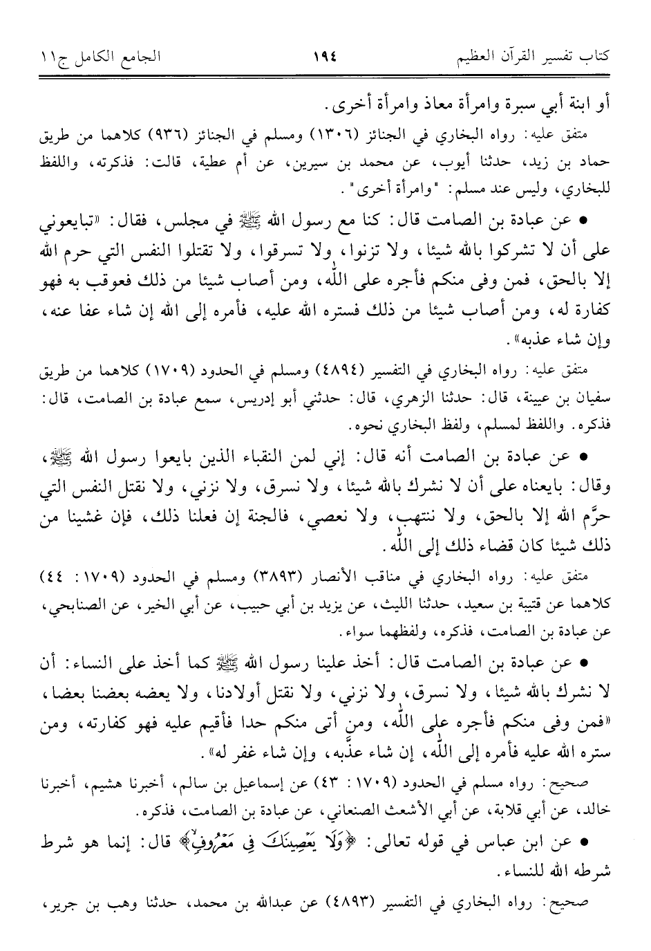• عن عبادة بن الصامت قال: كنا مع رسول الله - صلى الله عليه وسلم - في مجلس، فقال: "تبايعوني على أن لا تشركوا بالله شيئا، ولا تزنوا، ولا تسرقوا، ولا تقتلوا النفس التي حرم الله إلا بالحق، فمن وفى منكم فأجره على الله، ومن أصاب شيئا من ذلك فعوقب به فهو كفارة له، ومن أصاب شيئا من ذلك فستره الله عليه، فأمره إلى الله إن شاء عفا عنه، وإن شاء عذبه".