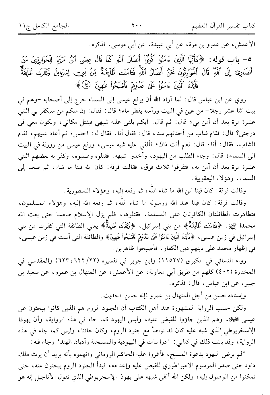 ٥ - باب قوله: {يَاأَيُّهَا الَّذِينَ آمَنُوا كُونُوا أَنْصَارَ اللَّهِ كَمَا قَالَ عِيسَى ابْنُ مَرْيَمَ لِلْحَوَارِيِّينَ مَنْ أَنْصَارِي إِلَى اللَّهِ قَالَ الْحَوَارِيُّونَ نَحْنُ أَنْصَارُ اللَّهِ فَآمَنَتْ طَائِفَةٌ مِنْ بَنِي إِسْرَائِيلَ وَكَفَرَتْ طَائِفَةٌ فَأَيَّدْنَا الَّذِينَ آمَنُوا عَلَى عَدُوِّهِمْ فَأَصْبَحُوا ظَاهِرِينَ (١٤)}