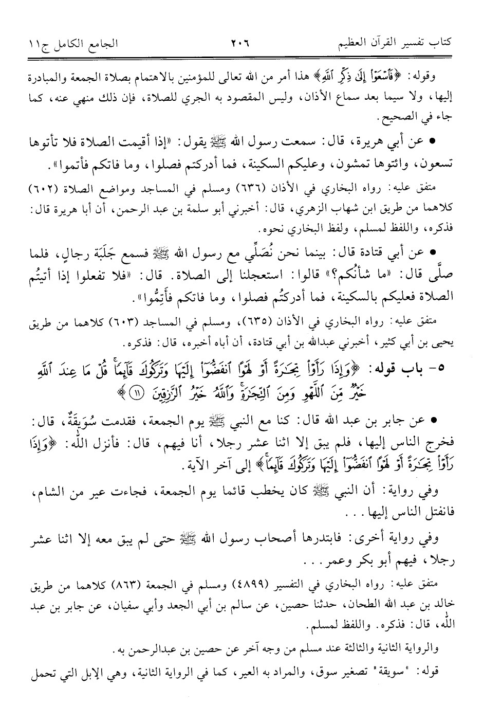 • عن جابر بن عبد الله قال: كنا مع النبي - صلى الله عليه وسلم - يوم الجمعة، فقدمت سُوَيقَةٌ، قال: فخرج الناس إليها، فلم يبق إلا اثنا عشر رجلا، أنا فيهم، قال: فأنزل الله: {وَإِذَا رَأَوْا تِجَارَةً أَوْ لَهْوًا انْفَضُّوا إِلَيْهَا وَتَرَكُوكَ قَائِمًا} إلى آخر الآية.