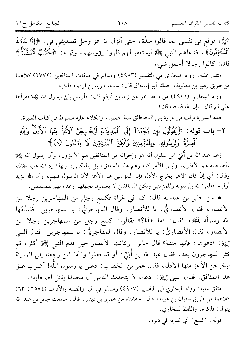 - صلى الله عليه وسلم -، فوقع في نفسي مما قالوا شدَّة، حتى أنزل الله عز وجل تصديقي في: {إِذَا جَاءَكَ الْمُنَافِقُونَ}، فدعاهم النبي - صلى الله عليه وسلم - ليستغفر لهم فلووا رؤوسهم، وقوله: {خُشُبٌ مُسَنَّدَةٌ} قال: كانوا رجالا أجمل شيء.