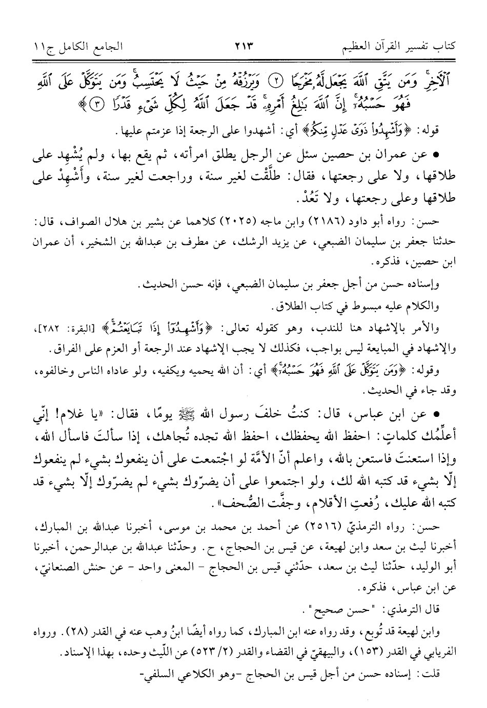 حسن: رواه الترمذيّ (٢٥١٦) عن أحمد بن محمد بن موسى، أخبرنا عبد الله بن المبارك، أخبرنا ليث بن سعد وابن لهيعة، عن قيس بن الحجاج، ح. وحدّثنا عبد الله بن عبد الرحمن، أخبرنا أبو الوليد، حدّثنا ليث بن سعد، حدّثني قيس بن الحجاج - المعنى واحد - عن حنش الصنعانيّ، عن ابن عباس، فذكره.