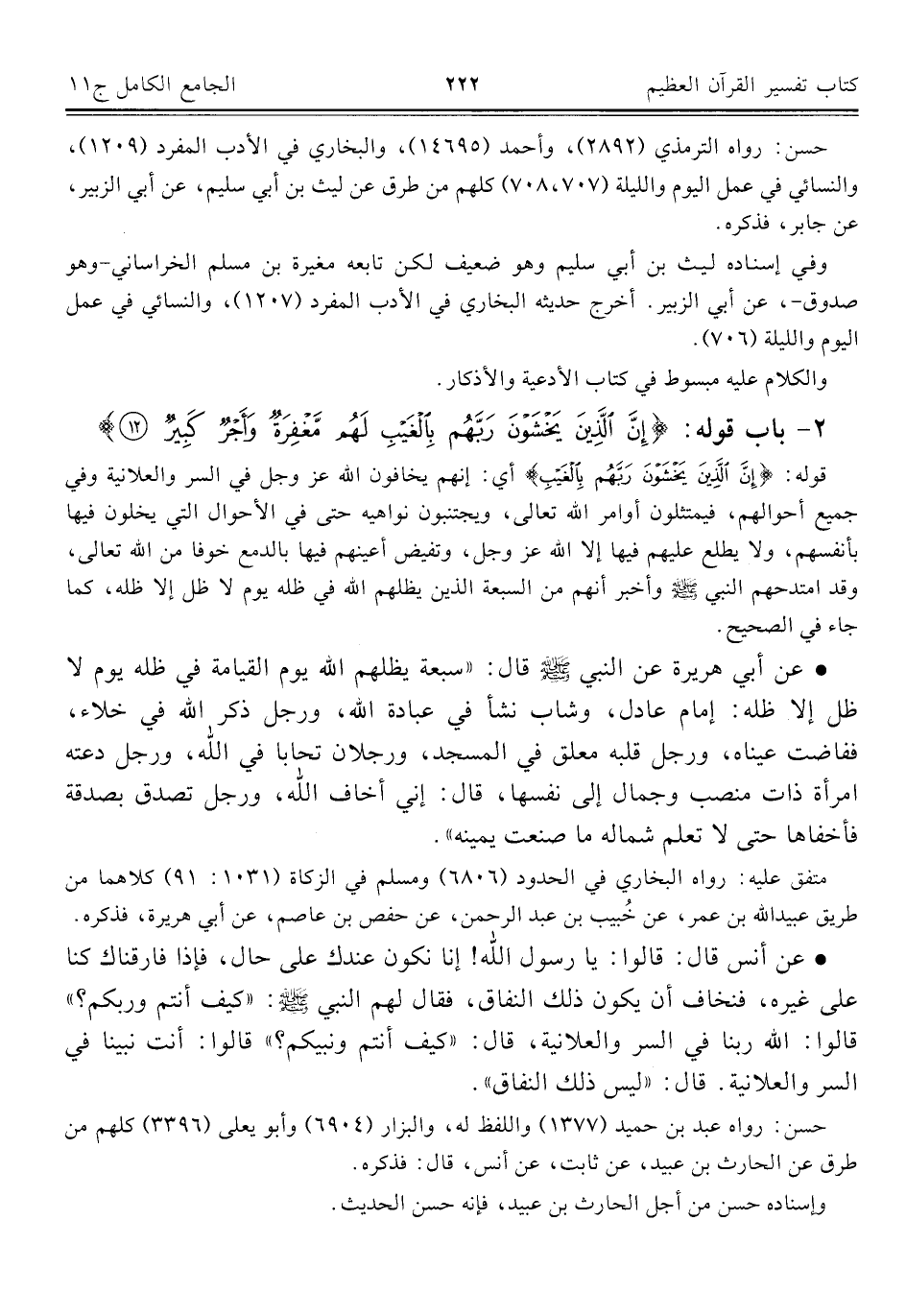 قوله: {إِنَّ الَّذِينَ يَخْشَوْنَ رَبَّهُمْ بِالْغَيْبِ} أي: إنهم يخافون الله عز وجل في السر والعلانية وفي جميع أحوالهم، فيمتثلون أوامر الله تعالى، ويجتنبون نواهيه حتى في الأحوال التي يخلون فيها بأنفسهم، ولا يطلع عليهم فيها إلا الله عز وجل، وتفيض أعينهم فيها بالدمع خوفا من الله تعالى، وقد امتدحهم النبي - صلى الله عليه وسلم - وأخبر أنهم من السبعة الذين يظلهم الله في ظله يوم لا ظل إلا ظله، كما جاء في الصحيح.