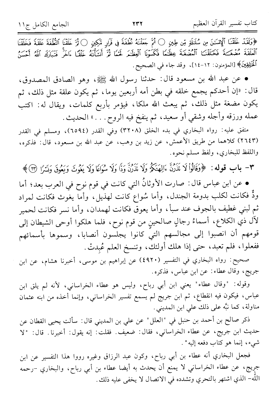• عن ابن عباس قال: صارت الأوثانُ التي كانت في قوم نوح في العرب بعد؛ أما ودٌّ فكانت لكلب بدومة الجندل، وأما سُواع كانت لهذيل، وأما يغوث فكانت لمراد ثم لبني غطيف بالجوف عند سبأ، وأما يعوق فكانت لهمدان، وأما نسر فكانت لحمير لآل ذي الكلاع، أسماءُ رجالٍ صالحينٍ من قوم نوح، فلما هلكوا أوحى الشيطان إلى قومهم أن انصبوا إلى مجالسهم التي كانوا يجلسون أنصابا، وسموها بأسمائهم ففعلوا، فلم تعبد، حتى إذا هلك أولئك، وتنسخ العلم عُبِدتْ.
